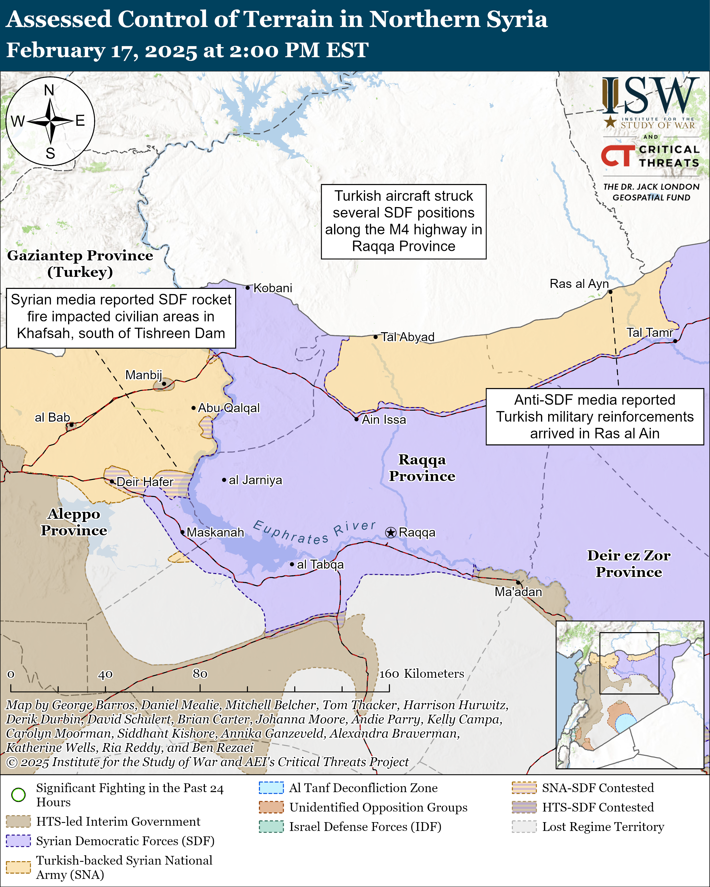 Turkish aircraft struck several SDF positions along the M4 highway in Raqqa Province on February 17. Anti-SDF media reported that Turkish aircraft struck and destroyed an SDF rocket launcher in Tarwazia along the M4 highway.[32] Turkey also reportedly struck an SDF base in Saykul, near Ain Issa.[33] Anti-SDF media reported that numerous SDF members were killed or injured in the strike.[34]