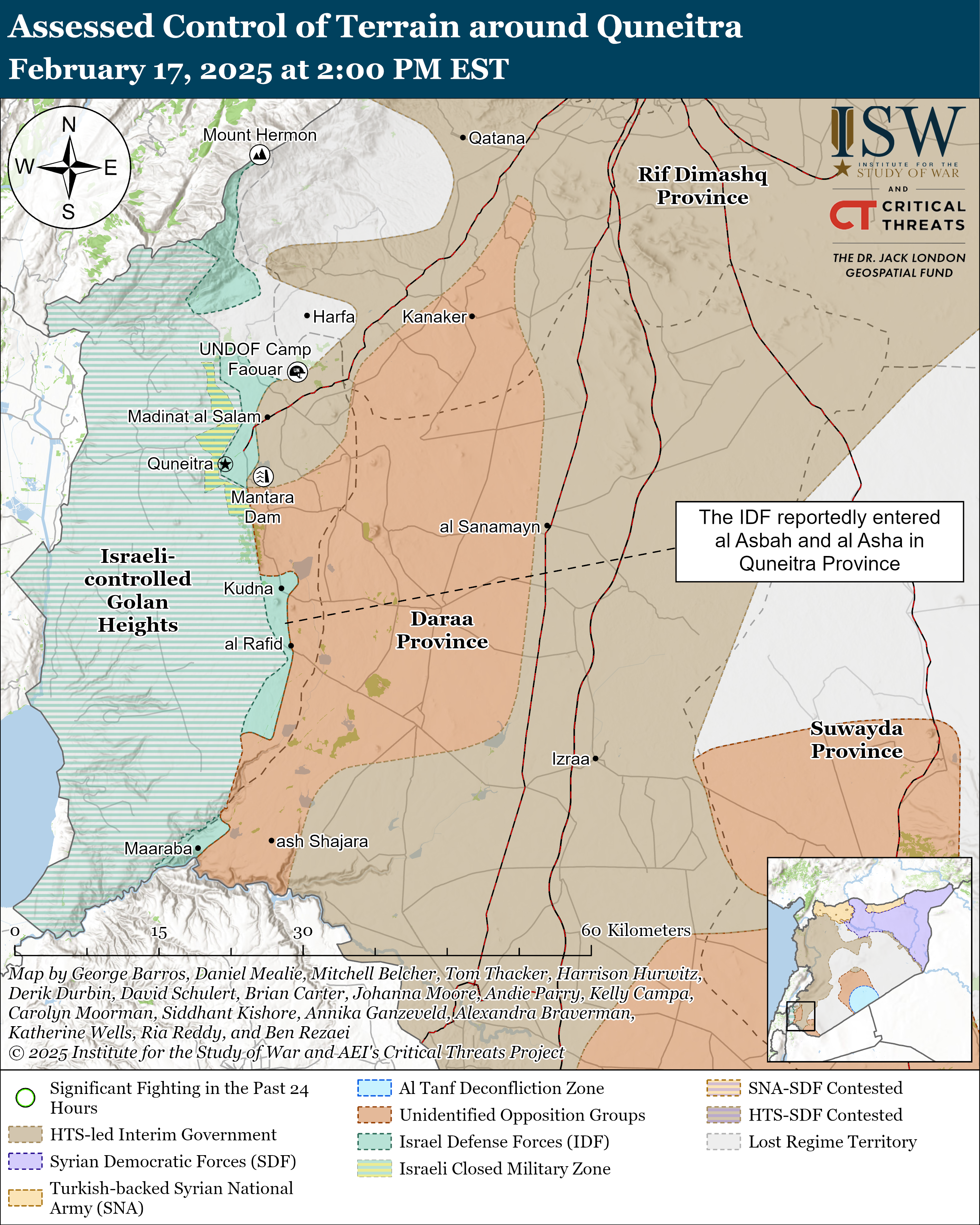 The IDF continued to operate along the Golan Heights in southern Syria. Syrian media reported that Israeli forces entered al Asbah and al Asha in Quneitra Province on February 17.[44]