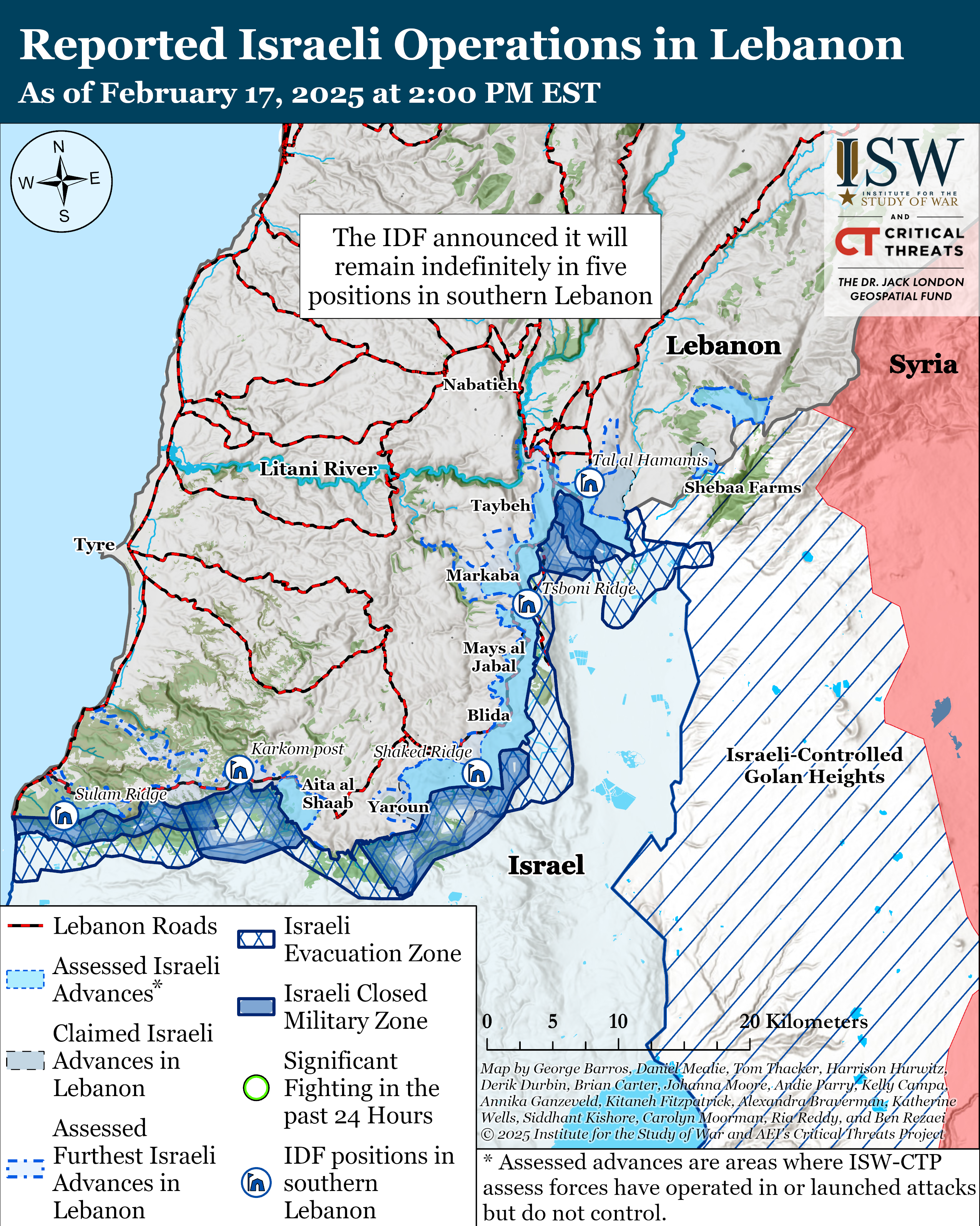 - Lebanon: The IDF announced plans to remain indefinitely at five locations in southern Lebanon, as the IDF withdraws from most other positions.