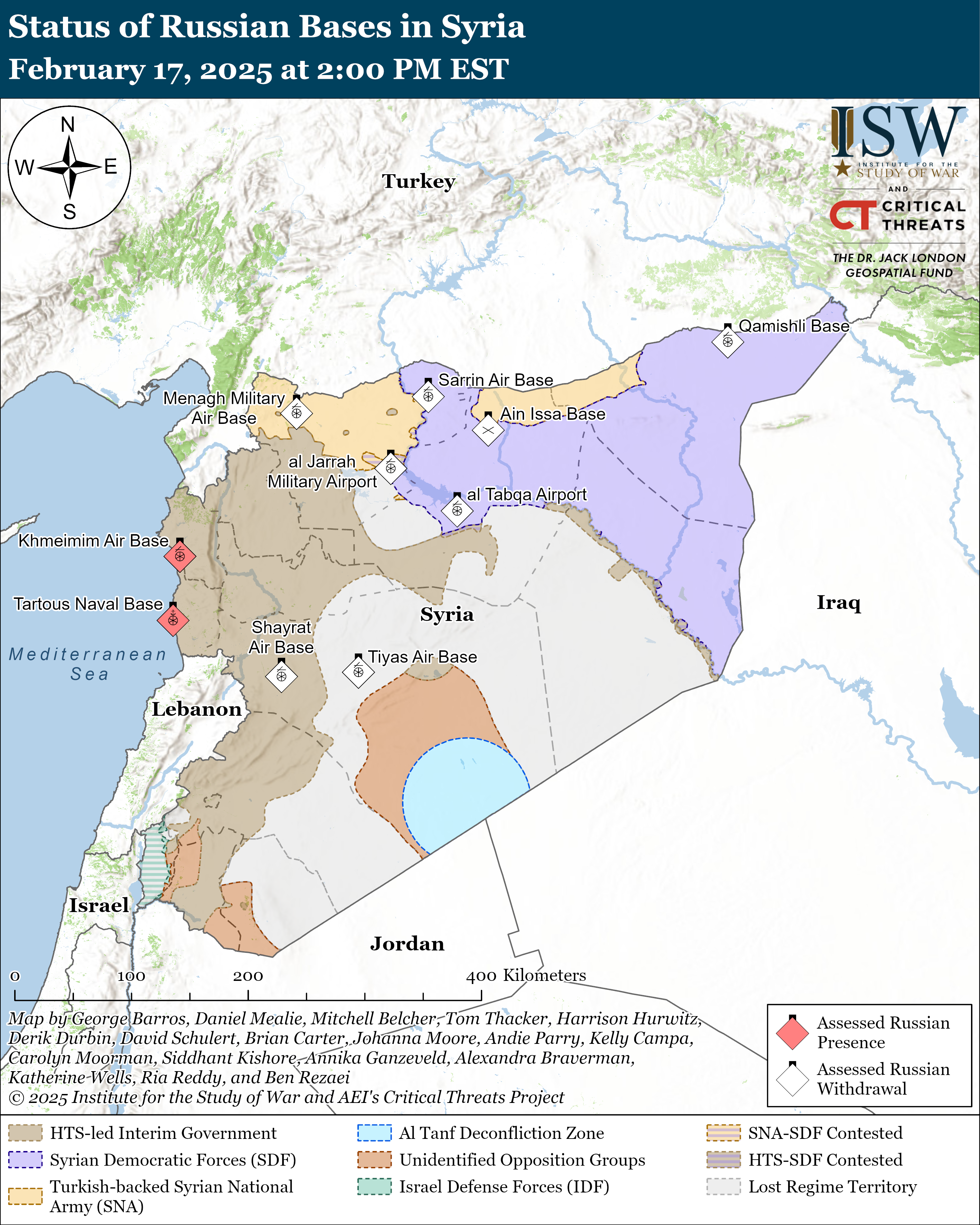 The tone of engagement between Russia and the Syrian interim government has notably become more cooperative in recent weeks, which supports the sources’ claims that Russia may be nearing an agreement with Syria. Shara emphasized Syria’s “strong strategic relationship“ with Russia during a recent phone call with Russian President Vladimir Putin.[6] Interim Syrian Defense Minister Marhaf Abu Qasra recently suggested that Syria could allow Russia to retain air and naval bases in Syria if there are “benefits” for Syria.[7] It is not clear what “benefits“ Russia may be offering Syria in current negotiations. Russia delivered local Syrian currency to the Syrian central bank on February 12 in a gesture that likely sought to foster goodwill with the Syrian government.[8] This gesture followed Syrian officials’ demands that Russia pay its debts to the Syrian state and Putin’s offer to Shara to assist with Syria’s economy.[9]