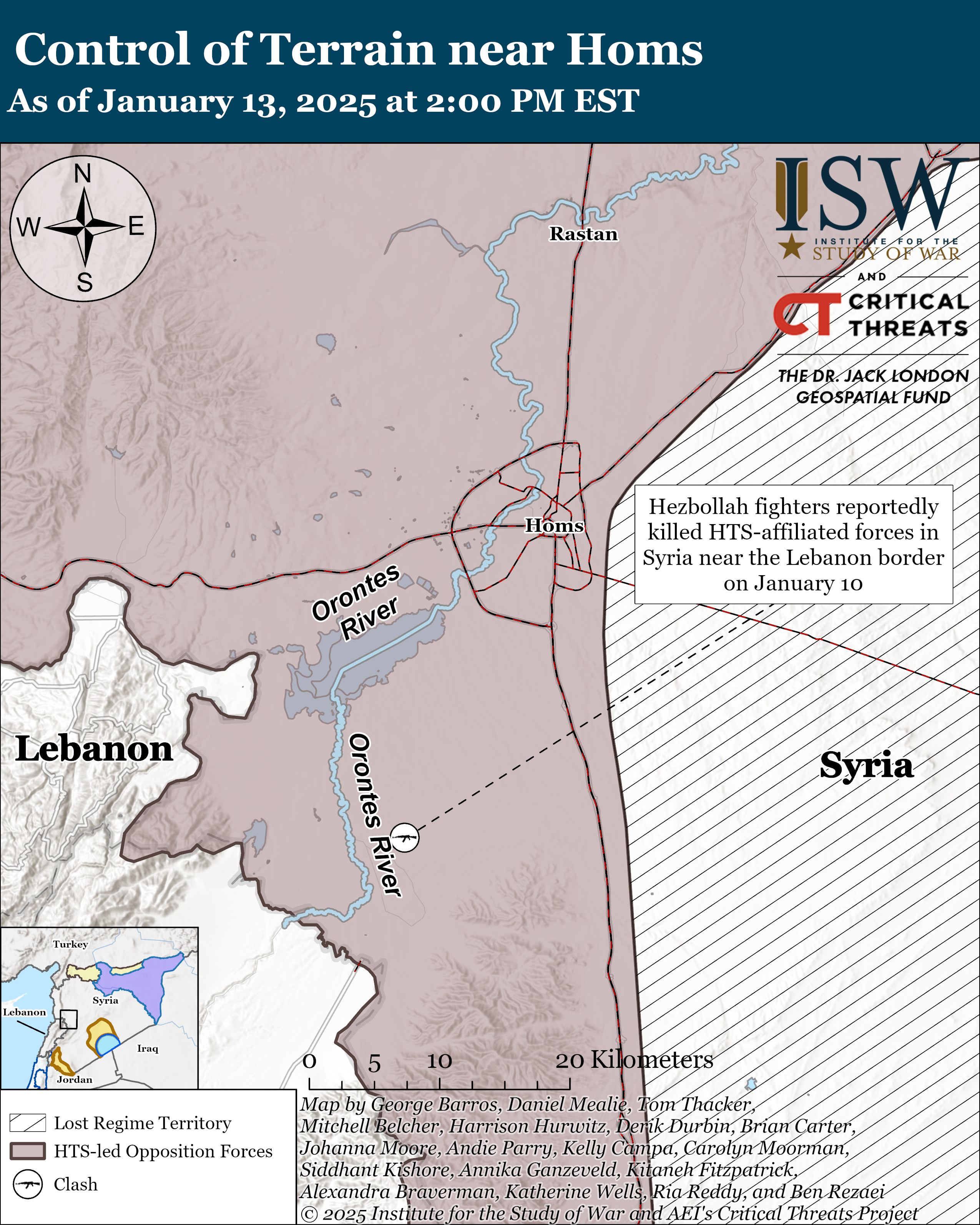 Hezbollah fighters reportedly killed HTS-affiliated forces in Syria near the Lebanon border on January 10. A Syrian source claimed that Hezbollah fighters killed five HTS fighters in western Qusayr and subsequently wrote threatening messages on their bodies.[37] Other Syrian sources said that the Hezbollah fighters killed five civilians, however.[38] CTP-ISW cannot independently verify the parties involved in the engagement or that it occurred. This engagement would be notable however, given that Qusayr lies on a key line of communication that Hezbollah has long used to move weapons and other equipment into Lebanon.[39] The Qusayr area has long served as a smuggling route for other armed groups, including some hostile to Hezbollah and Iran. HTS-led Syrian interim government officials met with a senior Lebanese delegation in Damascus to discuss border security, counter-smuggling efforts, and immigration on January 11, a day after the reported engagement.[40] These border smuggling routes, including near Qusayr, could allow Lebanese Hezbollah to reconstitute militarily. The border policies that the HTS-led interim government and Lebanon enact in the coming months will be one of many factors in determining how easily Iran can revive its ground line of communication to Hezbollah.