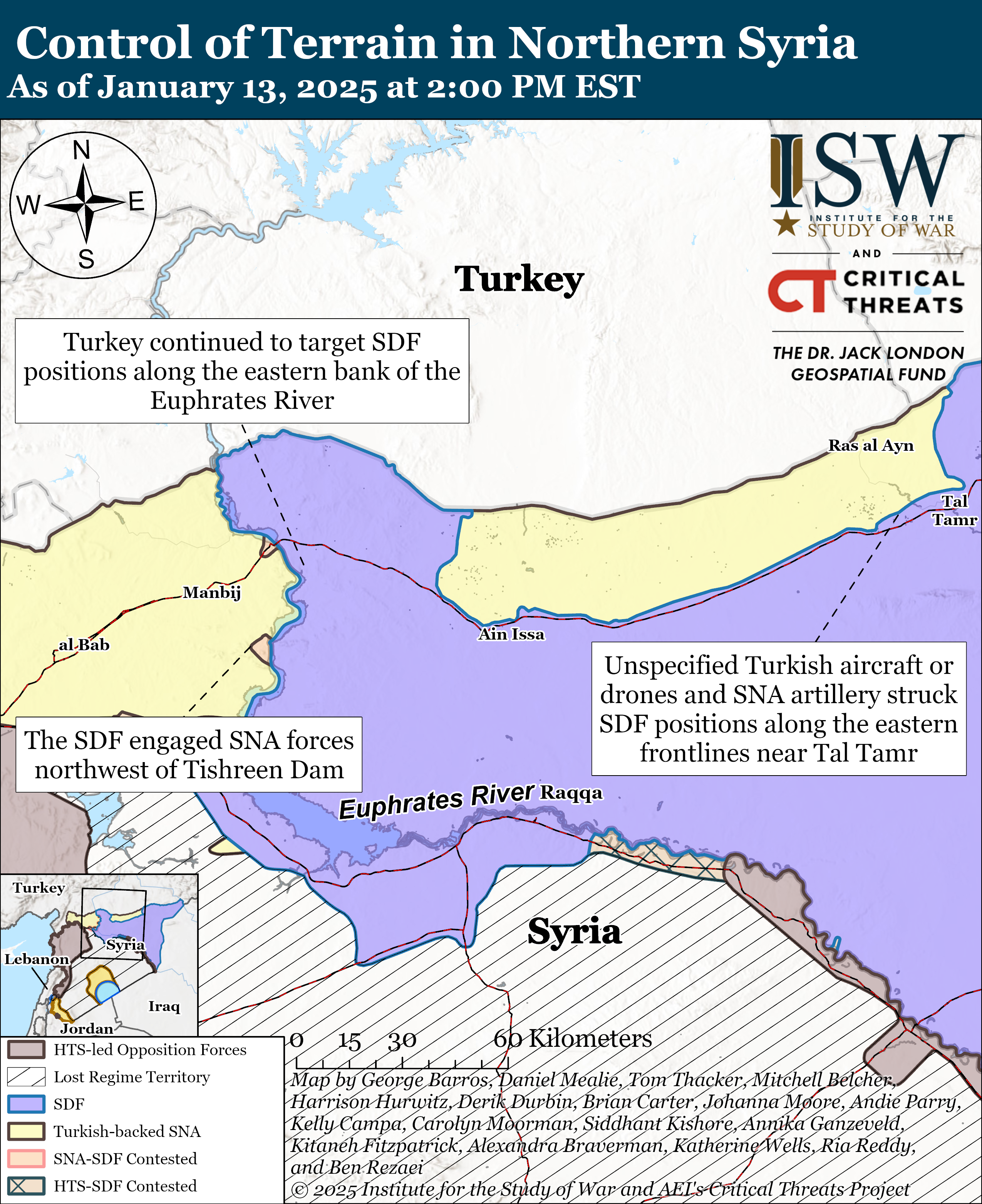 Turkey has continued to support SNA efforts to isolate and destroy SDF elements along the Euphrates River. Turkey and the SNA are attempting to isolate the SDF forces in their bridgeheads on the western bank of the Euphrates by striking along supply lines and key nodes behind the front while pressuring the SDF bridgeheads with ground attacks. Local, anti-SDF media reported that Turkey struck an SDF barracks and two guard posts in Sarrin, east of the Qara Qozak bridge.[20] The SDF operates from a base in Sarrin that Russian forces evacuated after the fall of the regime, meaning that Turkey is striking an SDF rear base that could be used to sustain the bridgeheads.[21] Turkey also reportedly conducted several airstrikes targeting SDF positions west of the Tishreen Dam.[22]