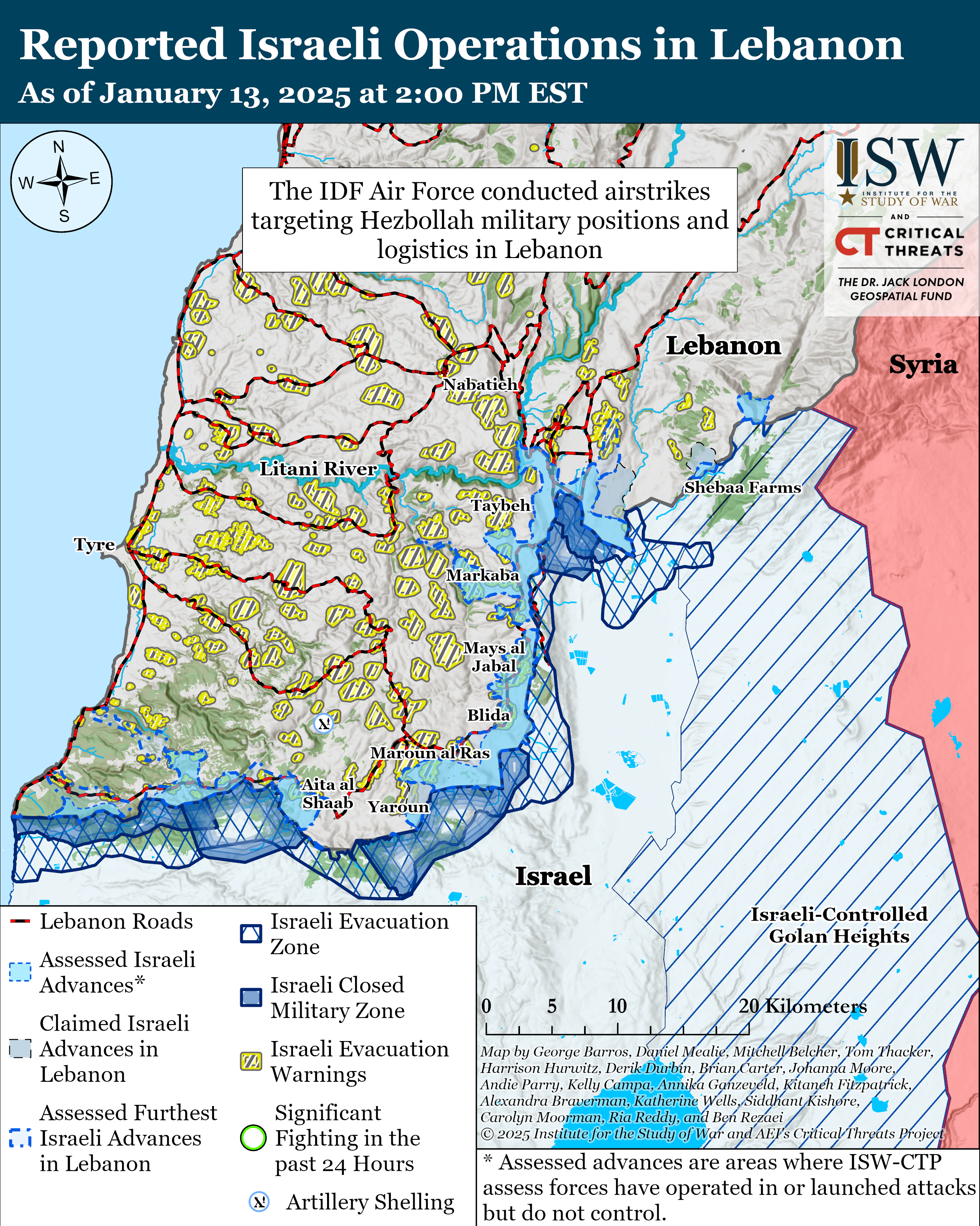 Lebanese and Hezbollah-affiliated media claimed on January 13 that Israeli forces conducted “large-scale” ground operations in Khiam, Marjaayoun Province.[78] Israeli forces previously withdrew from Khiam on December 11.[79] CTP-ISW cannot independently verify IDF’s presence in Khiam or the scale of operations there at this time.
