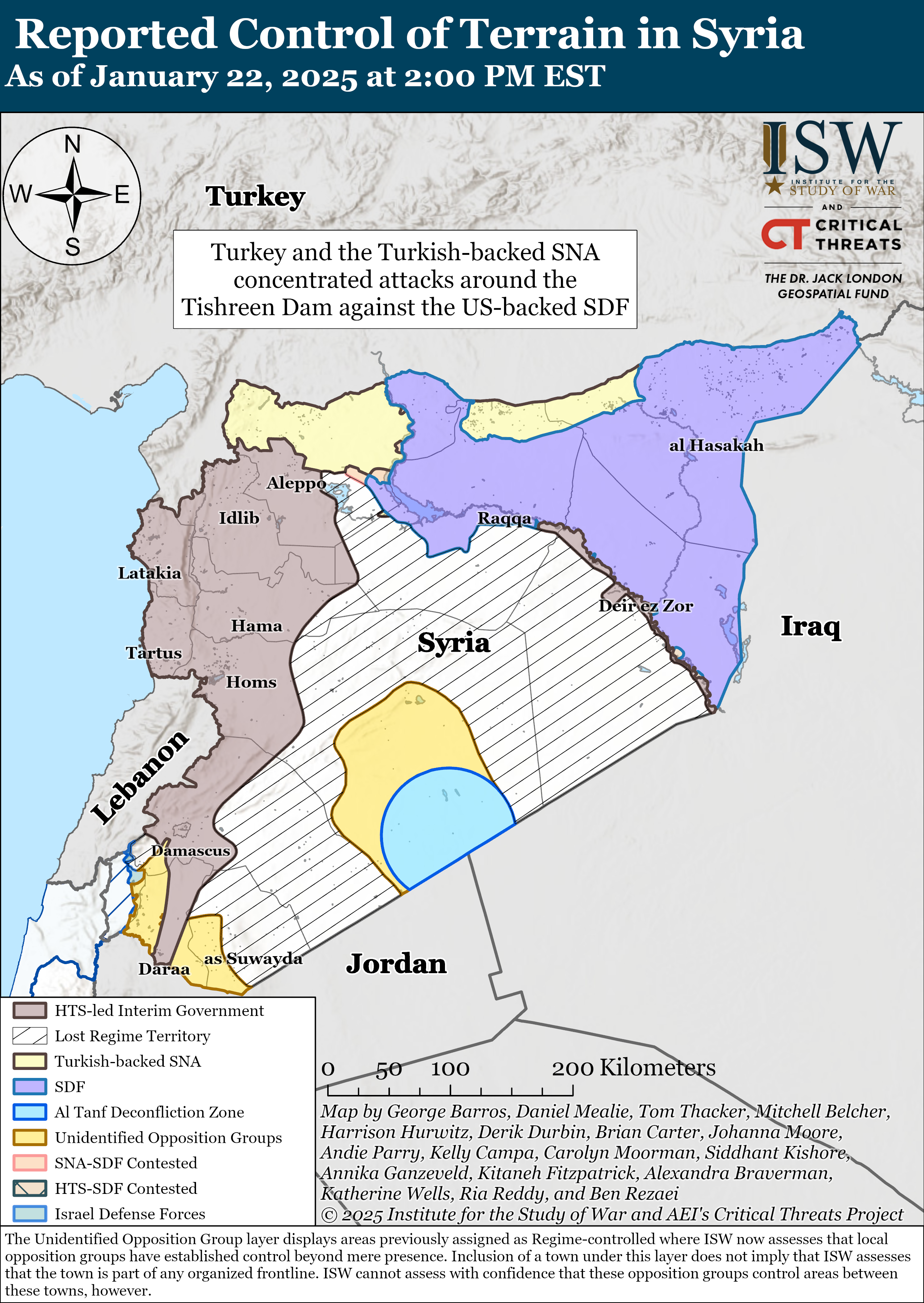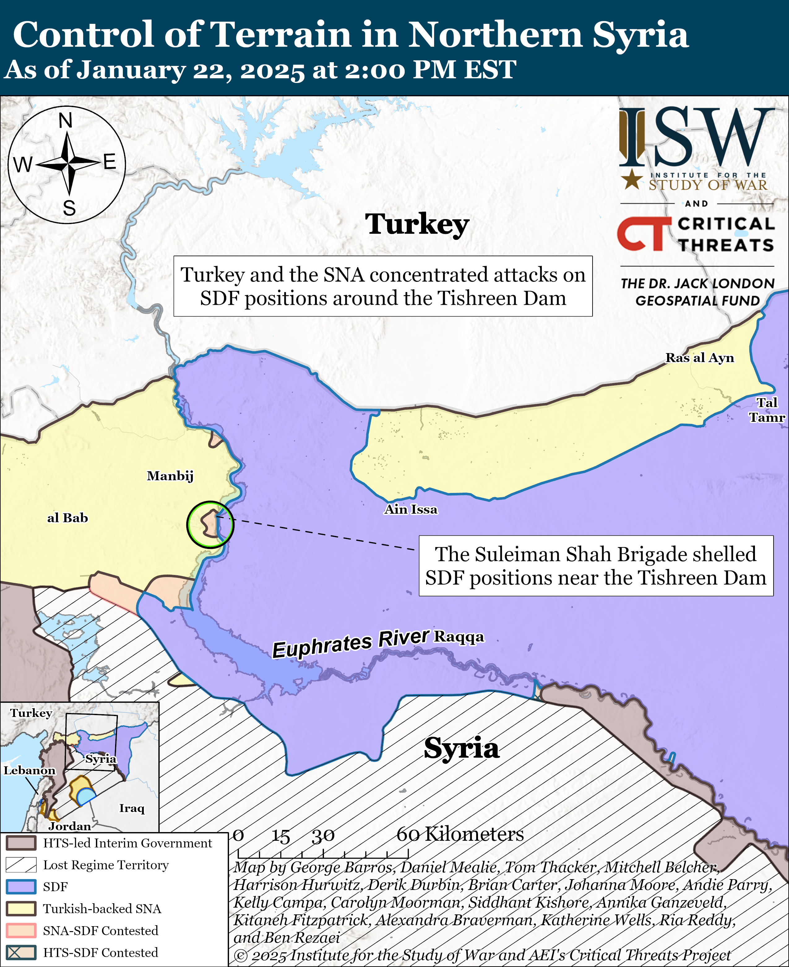 Turkey and the Turkish-backed Syrian National Army (SNA) concentrated attacks around the Tishreen Dam against the US-backed Syrian Democratic Forces (SDF). The US-sanctioned Suleiman Shah Brigade, which is an SNA formation, posted footage on January 21 in which its forces fired artillery and rockets at SDF positions around the Tishreen Dam.[19] Anti-SDF media circulated footage from the SNA Dawn of Freedom Operations Room in which SNA fighters fired an anti-tank-guided munition at an SDF position near the Tishreen Dam.[20]