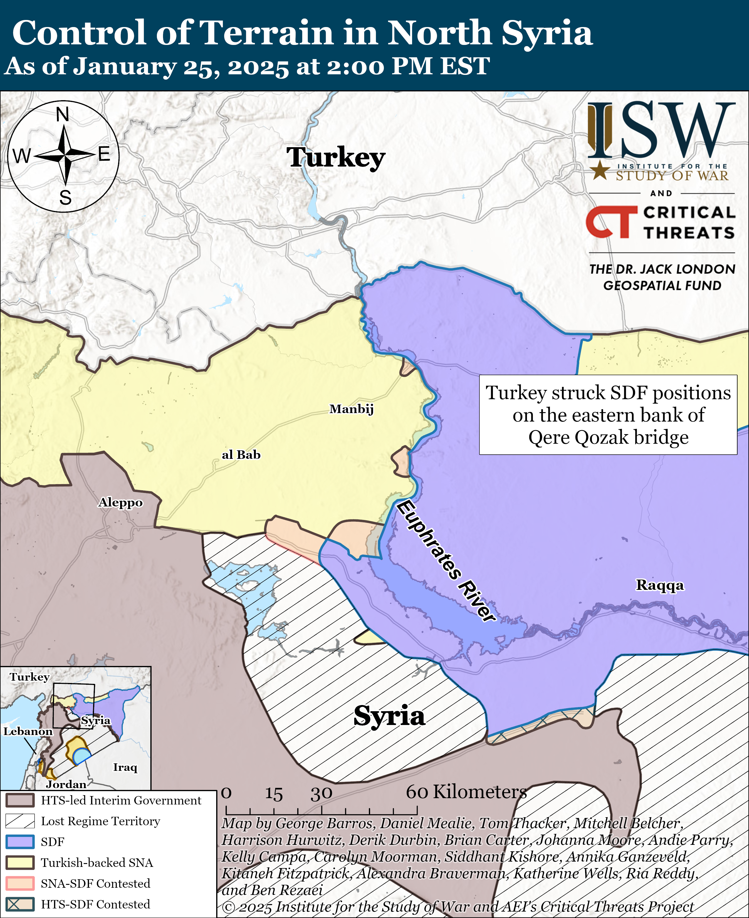 Turkey and the Turkish-backed Syrian National Army (SNA) continued to attack SDF positions surrounding the Qara Qozak bridge and Tishreen Dam on January 25. The SDF repelled two separate SNA attacks in Deir Hafer and Syriatel Hill killing and wounding an unspecified number of SNA fighters. Turkey conducted at least four airstrikes on SDF positions east of the Qara Qozak Bridge.[13] Turkey and the SNA conducted air and artillery strikes targeting SDF positions near the Tishreen Dam.[14] Geolocated footage posted on January 25 shows the SDF striking SNA fighters and vehicles west of the Tishreen Dam.[15] Anti-SDF media claimed that a Turkish drone strike targeted an SDF convoy traveling to the Tishreen Dam, causing it to retreat.[16] The SNA and SDF reportedly exchanged artillery fire near the M4 highway, north of Raqqa.[17] Anti-SDF media reported that the SNA separately shelled SDF positions in Bin Hasu, south of Kobani.[18]