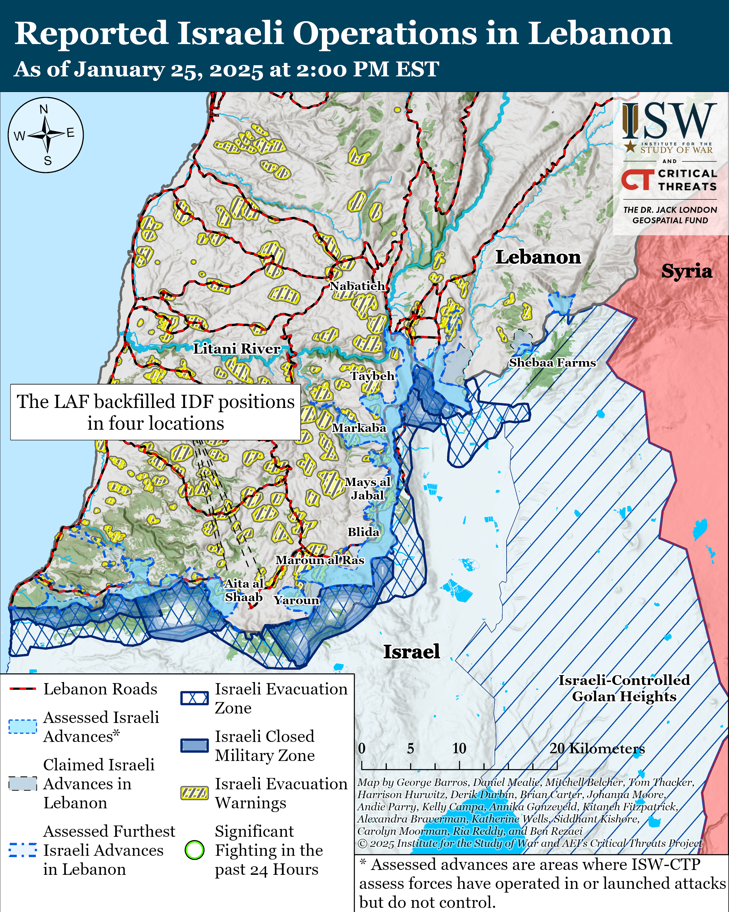 The LAF backfilled IDF positions in four locations in Bint Jbeil Governorate, southeastern Lebanon, on January 25.[47]