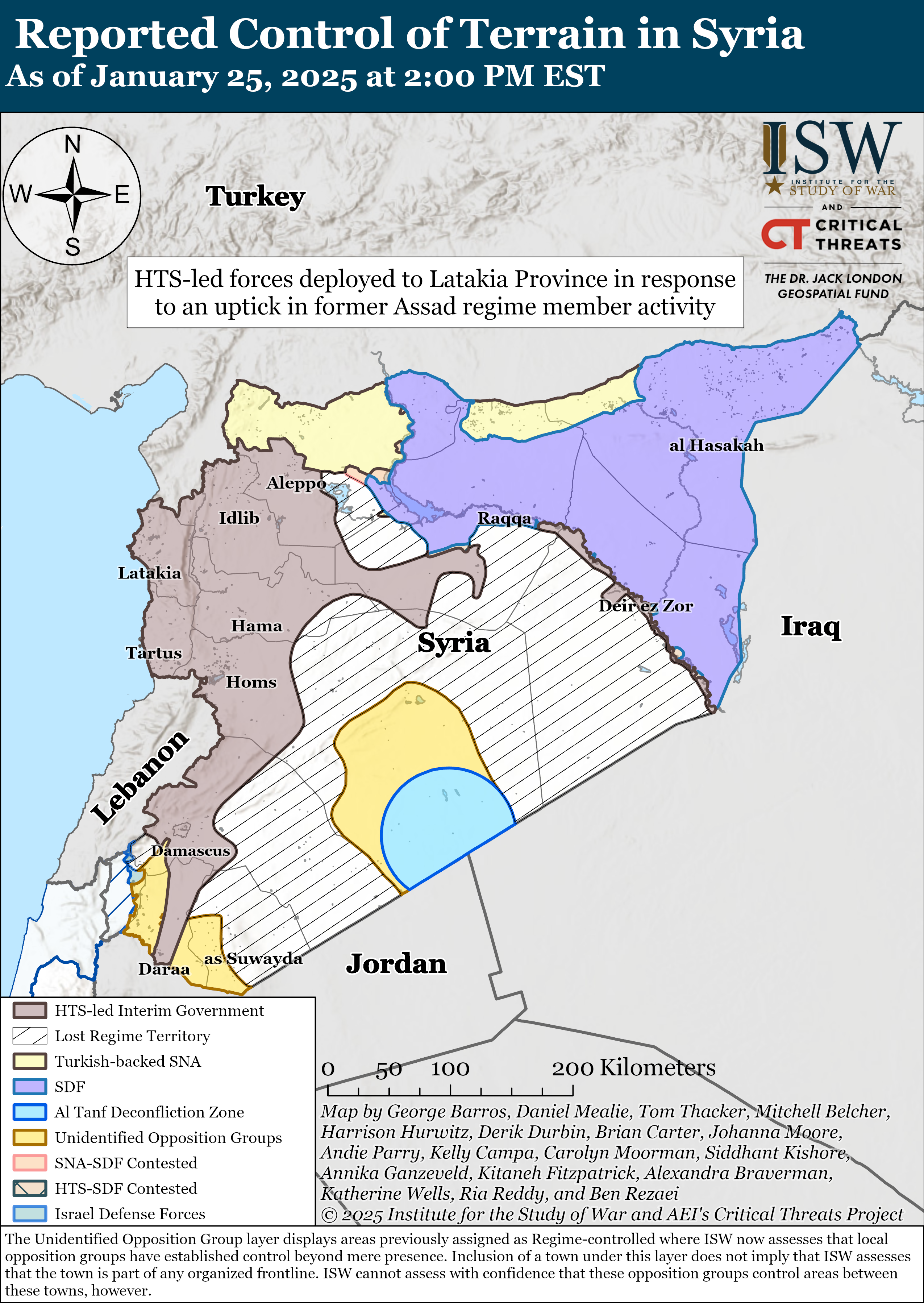 HTS-led forces deployed to Latakia Province in response to an uptick in former Assad regime member activity.[21] Syrian security forces killed former Assad regime members who attempted to conduct two separate attacks on HTS checkpoints in Latakia Province.”[22] Syrian Public Security forces also arrested at least seven former Assad regime members during clearing operations in Jableh.[23] Former Assad regime member activity appears to be an uncoordinated, low-level threat to HTS control in Latakia. HTS has concentrated its clearing operations in Latakia Province, a former regime stronghold, since the fall of the Assad regime in December 2024.[24]