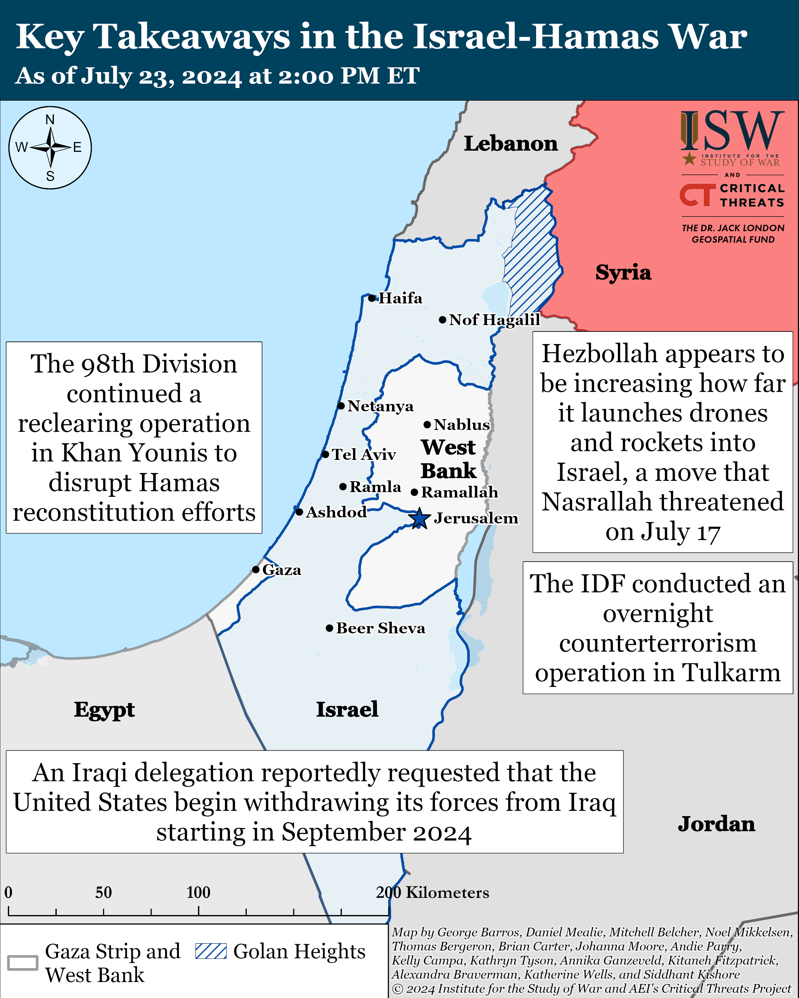 - Iraq: Four unspecified Iraqi sources cited by Reuters on July 22 claimed that an Iraqi delegation in Washington, DC, has requested the United States begin withdrawing its forces from Iraq starting in September 2024. CTP-ISW continues to assess that the United States and its partners in Iraq and Syria have successfully contained but not defeated ISIS and that a US withdrawal from Syria would very likely cause a rapid ISIS resurgence there within 12 to 24 months that would then spill into Iraq.