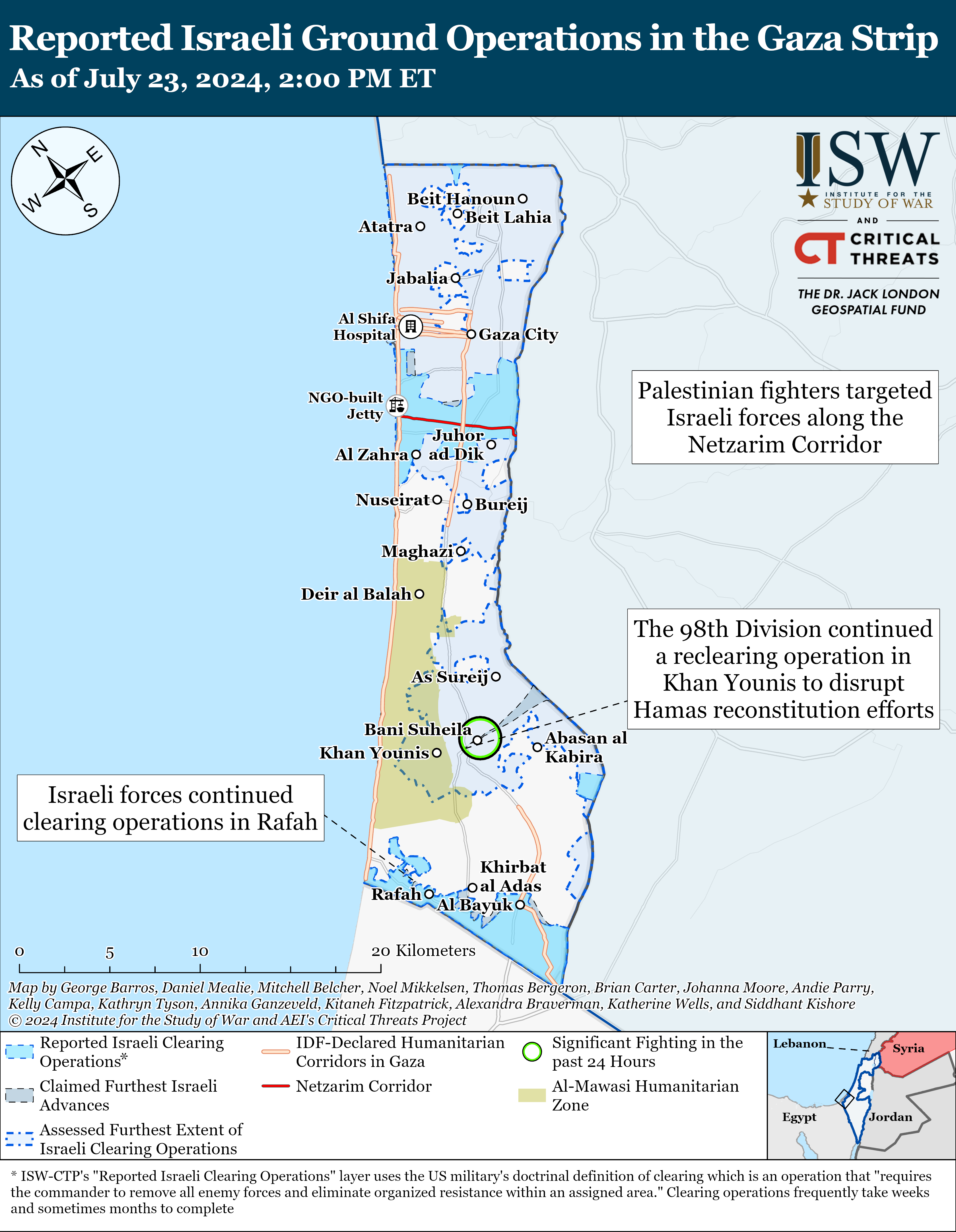 The Israel Defense Forces (IDF) 98th Division continued a new clearing operation in eastern Khan Younis on July 23.[40] The IDF reported that on July 22 that Hamas fighters had infiltrated into previously cleared areas of Khan Younis and had re-established militia infrastructure in the area, necessitating the re-clearing operation.[41] The IDF issued evacuation orders for civilians in Khan Younis on July 22.[42] Three IDF brigades concentrated their Khan Younis operations in Qarara, Bani Suheila, and Hamad.[43] The IDF 7th, 89th (Commando), and 35th (Paratroopers) Brigades engaged Palestinian fighters and cleared infrastructure in eastern Khan Younis.[44] Local sources reported on July 23 that Israeli forces were stationed in central Bani Suhelia.[45] Hamas targeted Israeli armor with rocket propelled grenades in Bani Suheila, east of Khan Younis.[46] An Israeli Army Radio correspondent reported on July 23 that Israeli forces have not experienced ”significant resistance” from Palestinian fighters on the ground and noted that there have been no IDF casualties yet.[47]