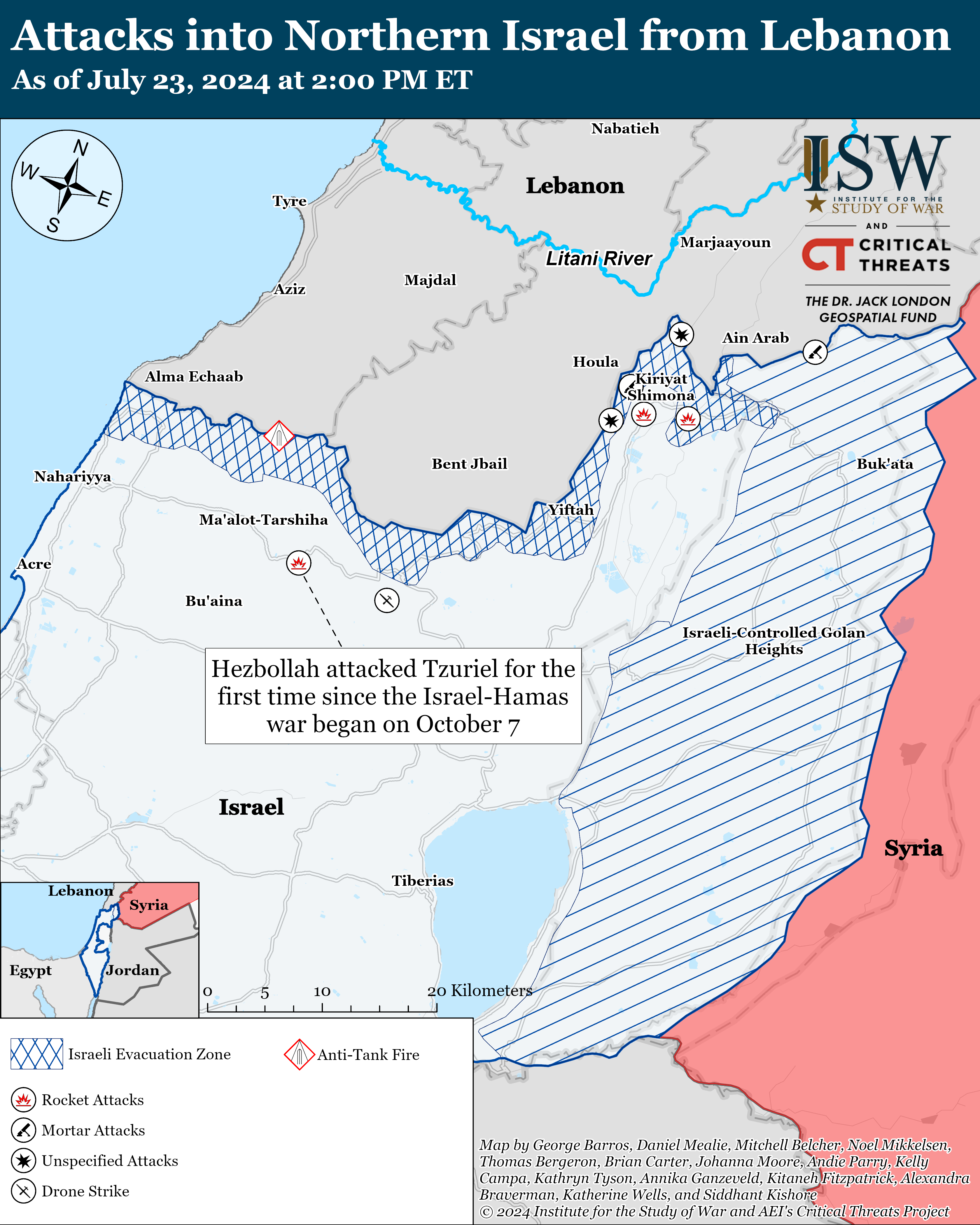 - Lebanon: Lebanese Hezbollah may be expanding the locations it targets in northern Israel. This expansion follows threats by Hezbollah leader Hassan Nasrallah to expand the group’s targets on July 17.
