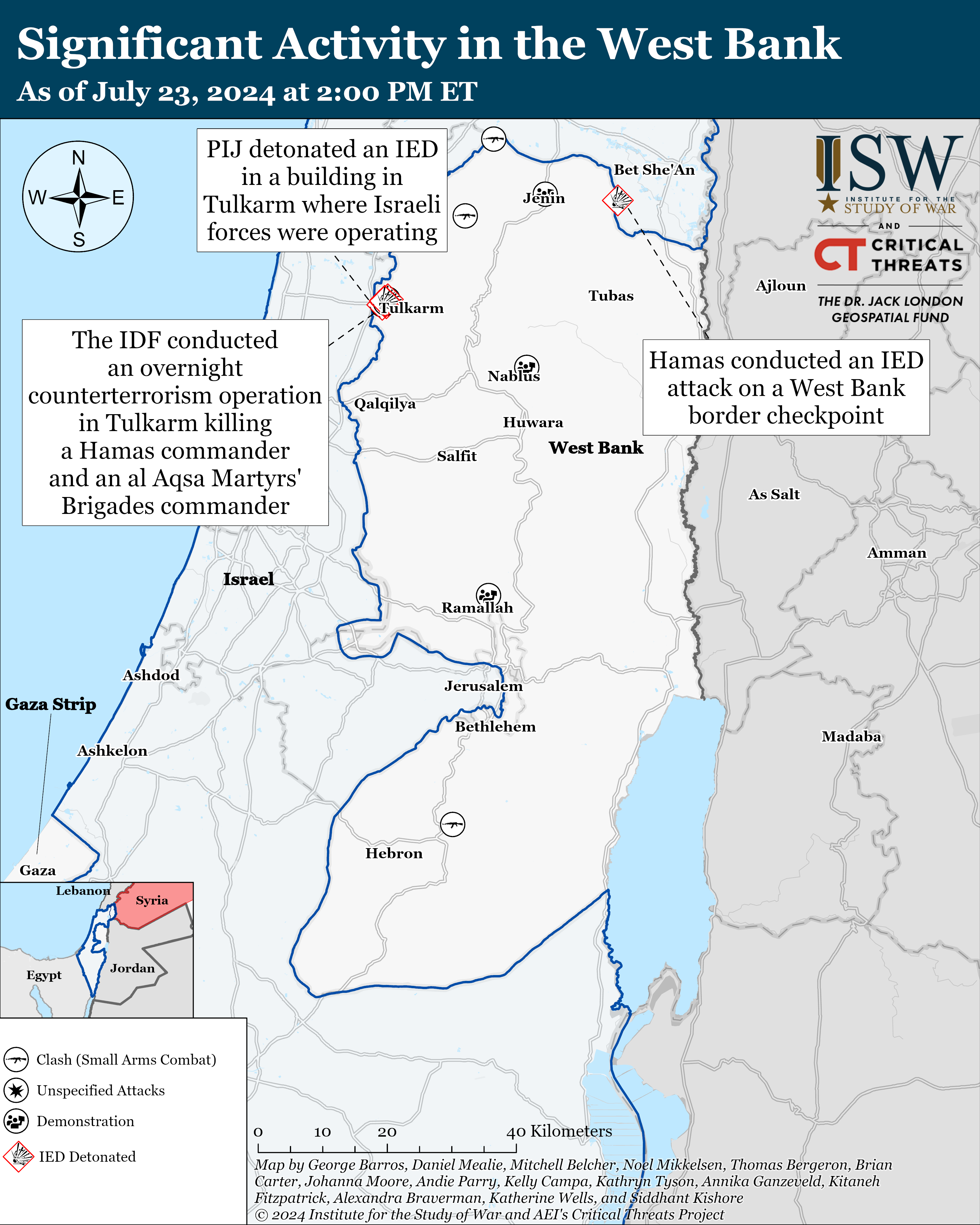 Israeli forces have engaged Palestinian fighters in at least nine locations in the West Bank since CTP-ISW’s last data cut-off on July 22.[63] Hamas mourned the death of two fighters who died during clashes with Israeli forces on July 23 in Sair, Hebron.[64] Hamas fighters detonated an IED on the border fence between Jalbul, in the West Bank, and Meirav, in Israel. The fighters then waited for Israeli forces to arrive to repair the fence before detonating a second IED. Hamas then waited for an IDF medic team to arrive at the scene before detonating a third IED.[65] Israeli forces searched the area following the explosions.[66]