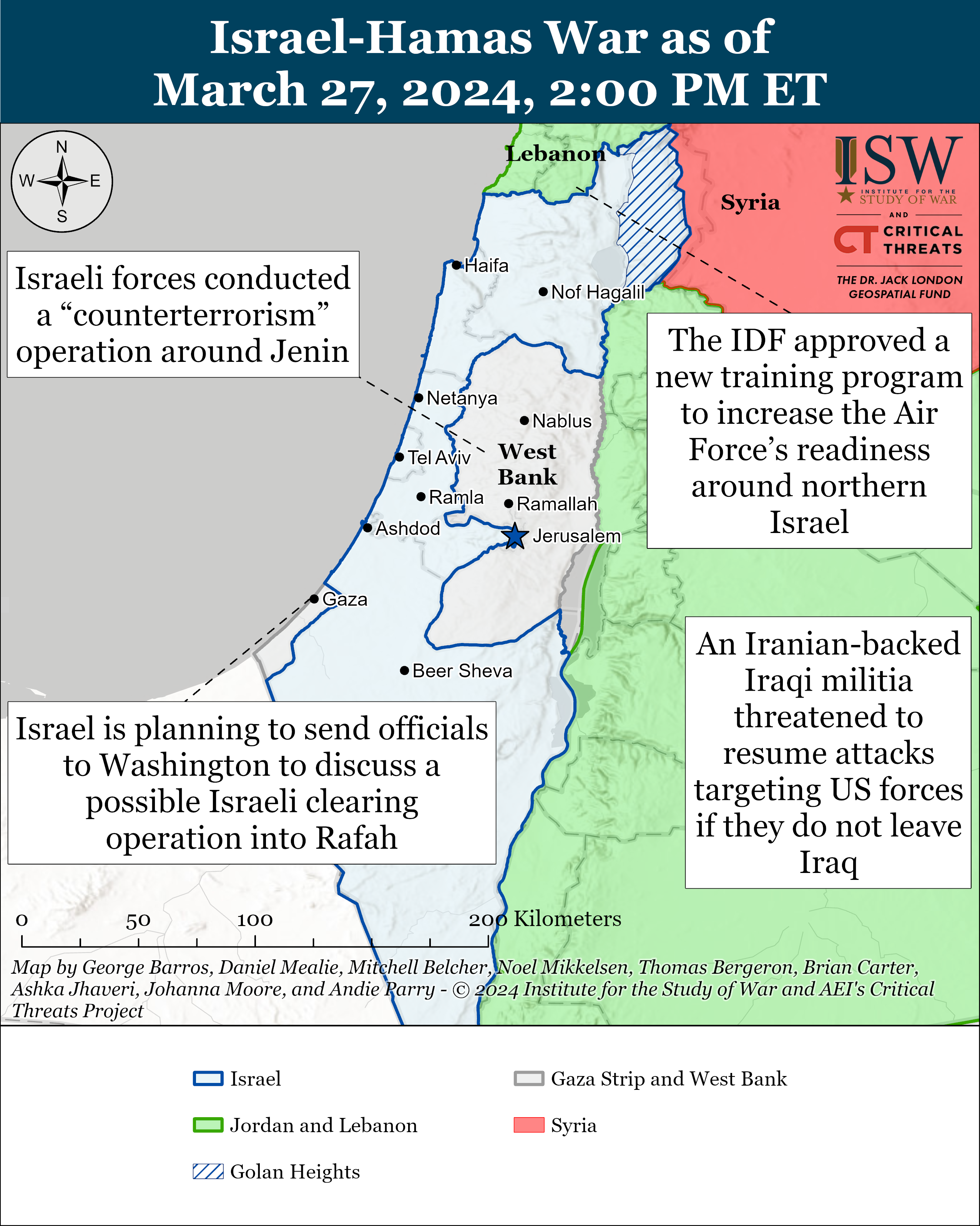 - Northern Gaza Strip: Israeli forces continued operating in and around al Shifa Hospital in Gaza City. Palestinian militias have conducted nearly 70 attacks targeting Israeli forces in and around the hospital since Israeli forces returned to the area on March 18.