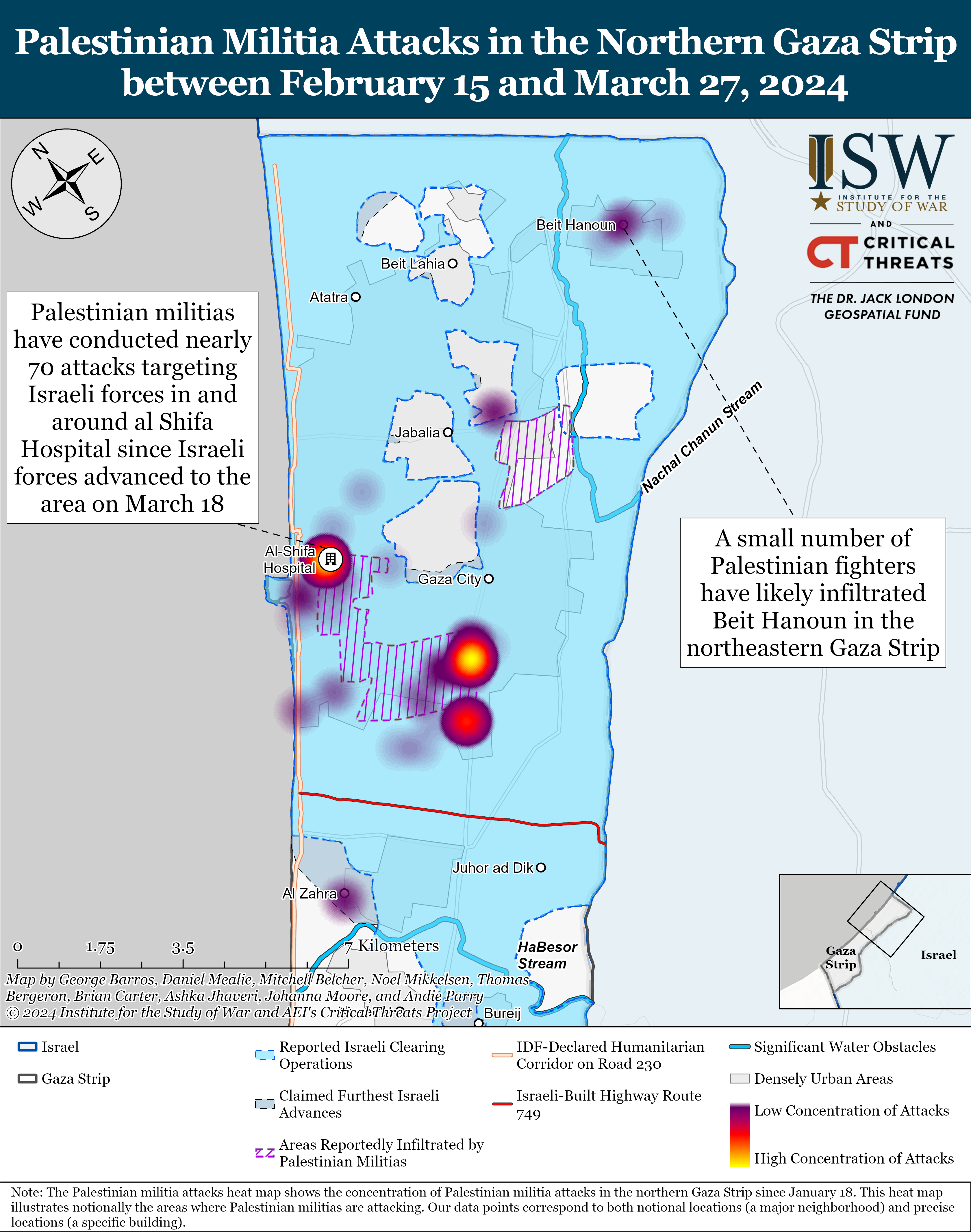 Most of the Palestinian militia attacks on March 27 targeted Israeli forces in and around al Shifa Hospital.[6] Palestinian militias have conducted nearly 70 attacks targeting Israeli forces in and around the hospital since Israeli forces returned to the area on March 18. This high rate of attack indicates that Palestinian militias retain a significant degree of combat effectiveness in the area, despite continued Israeli clearing efforts around Gaza City. At least six Palestinian militias have participated in the recent attacks targeting Israeli forces in and around al Shifa Hospital.