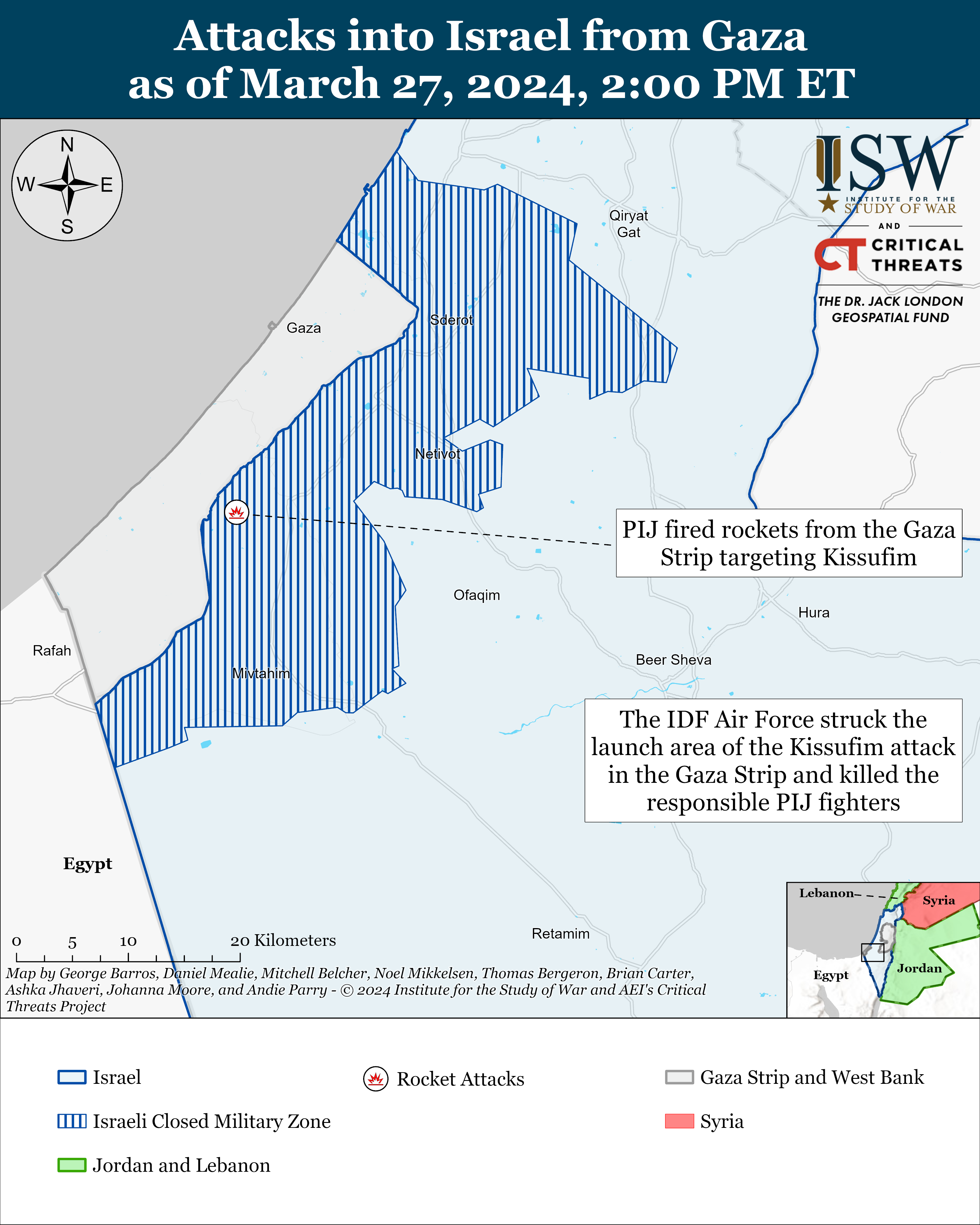 Israeli media reported on March 27, citing an unspecified Israeli official, that 25 aid trucks reached the northern Gaza Strip without incident.[29] The trucks entered the Gaza Strip through Gate 96, which Israel reportedly opened in early March 2024.[30]