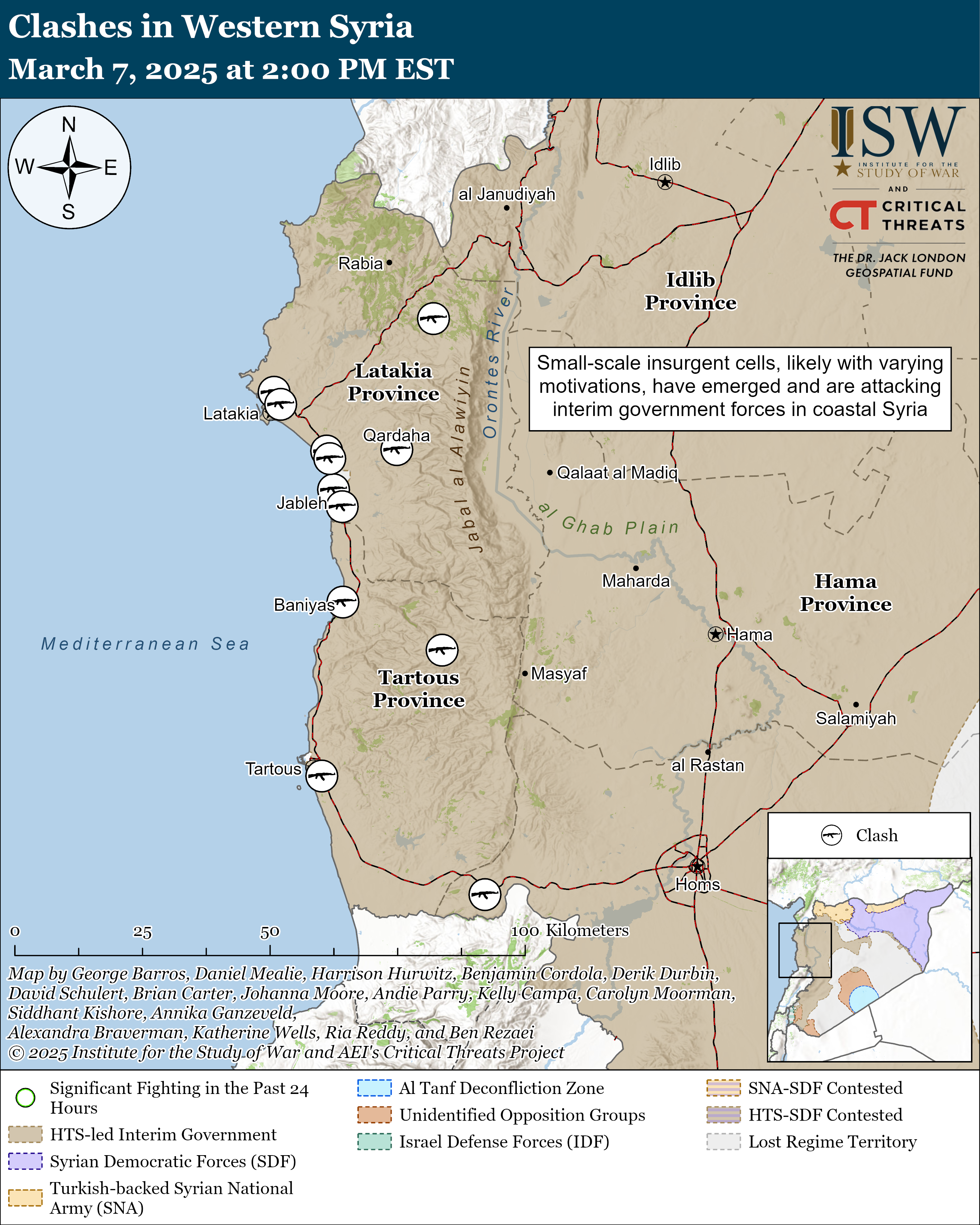 Insurgent cells continued to attack Syrian interim government personnel across Latakia and Tartous provinces as Syrian forces deployed to re-impose security over the coastal region.[1] Syrian government reinforcements deployed across to Tartous and Latakia on March 6 in response to coordinated attacks by Assadist insurgents on Syrian military checkpoints and patrols in Jableh, Latakia Province.[2] Clashes between Syrian government forces and insurgents spread overnight to other parts of Latakia and Tartous provinces.[3] The Syrian government deployed armored units, helicopters, and drone units to locate and target insurgents in the area.[4] Insurgents attempted to take control of hospitals across the coastal region and continued to attack security personnel as government forces advanced into coastal cities.[5] The Syrian government deployed armor, helicopters, and drone units to locate and target insurgents in the area.[6] Syrian government forces have killed or captured over 150 pro-Assad insurgents captured since March 6.[7]