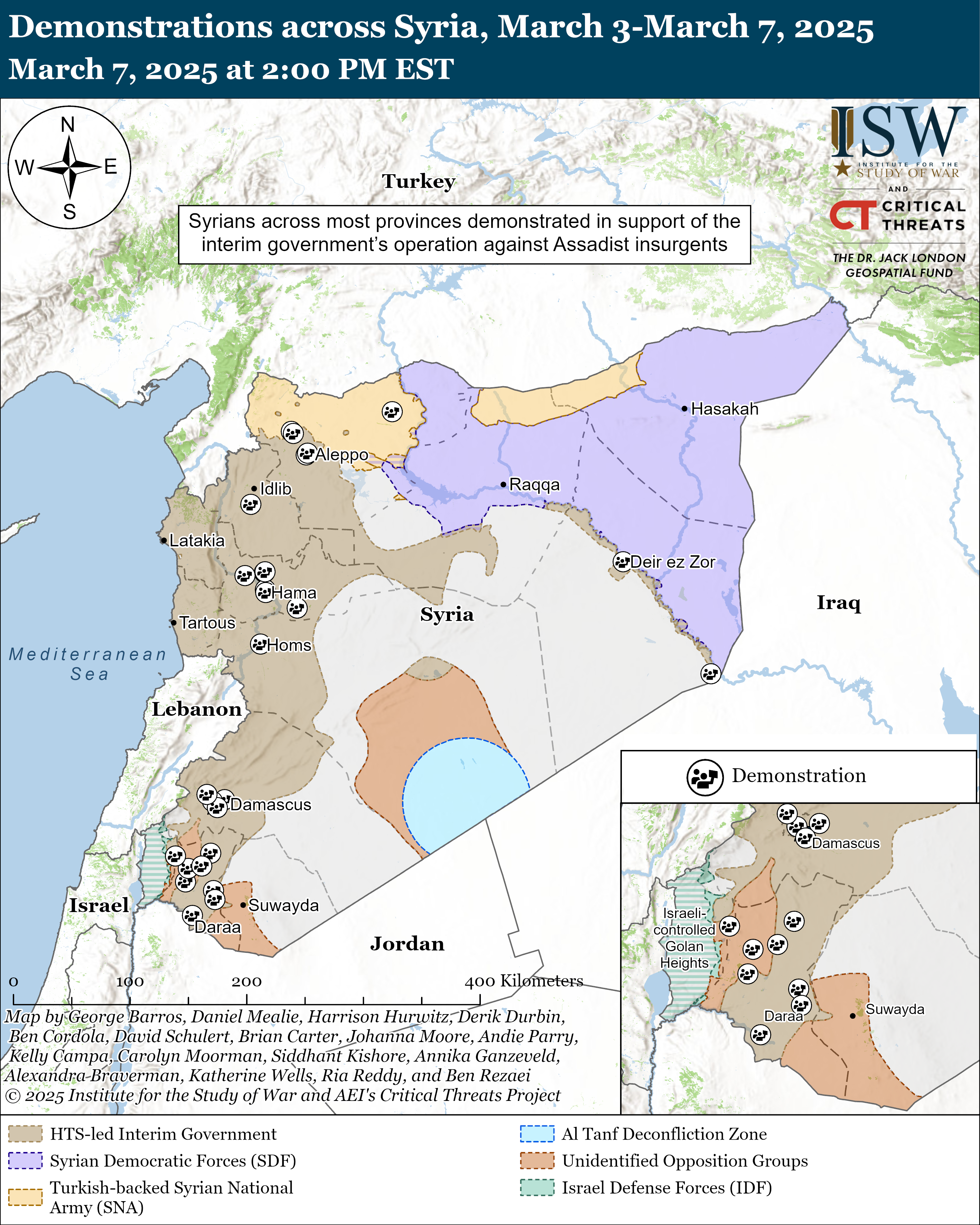 Syrians across most provinces demonstrated in support of the interim government’s operation against Assadist insurgents on March 7. Over 25 municipalities in nine provinces held demonstrations.[39] Assadist insurgents reportedly opened fire on demonstrators in Homs on March 6.[40] This substantial showing across Syria suggests that HTS retains popularity across broad swathes of the country.
