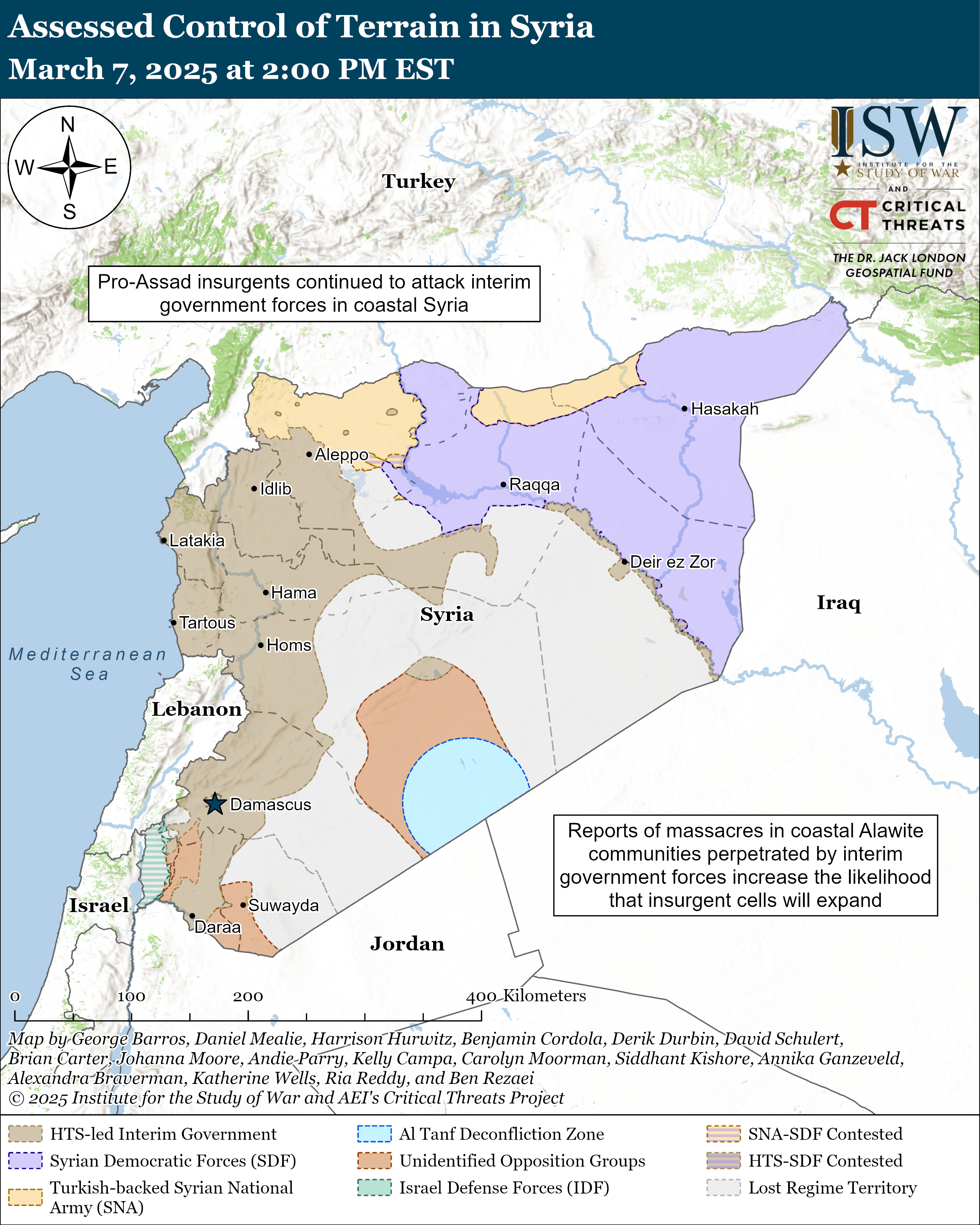 [30] https://www.reuters.com/world/middle-east/gunmen-kill-dozens-syrian-alawite-town-sources-war-monitor-say-2025-03-07/ ; https://x.com/GregoryPWaters/status/1897934299225374937