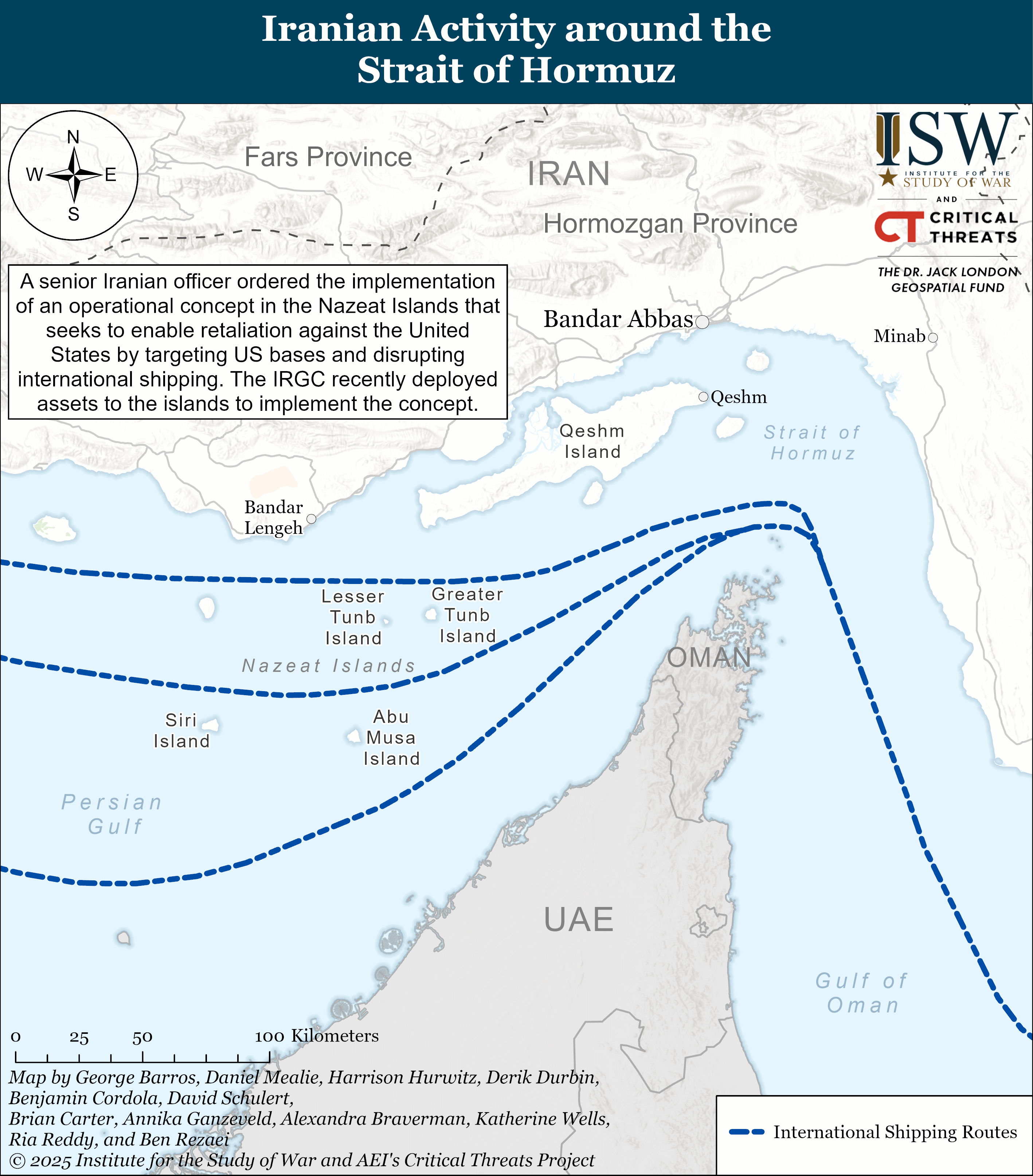 A group of Iranian parliamentarians echoed a senior Iranian military commander’s recent threat to close the Strait of Hormuz if Israel or the United States strikes Iranian energy infrastructure.[49] Armed Forces General Staff (AFGS) Chief Major General Mohammad Bagheri threatened on May 13 to disrupt international commercial shipping if the United States “makes a mistake.”[50] Bagheri recently inspected military positions in southern Iran and approved the deployment of military assets to the Nazeat Islands in the Persian Gulf.[51] Bagheri also ordered the IRGC to implement a new operational plan around these islands to enhance missile and drone strike capabilities.[52]