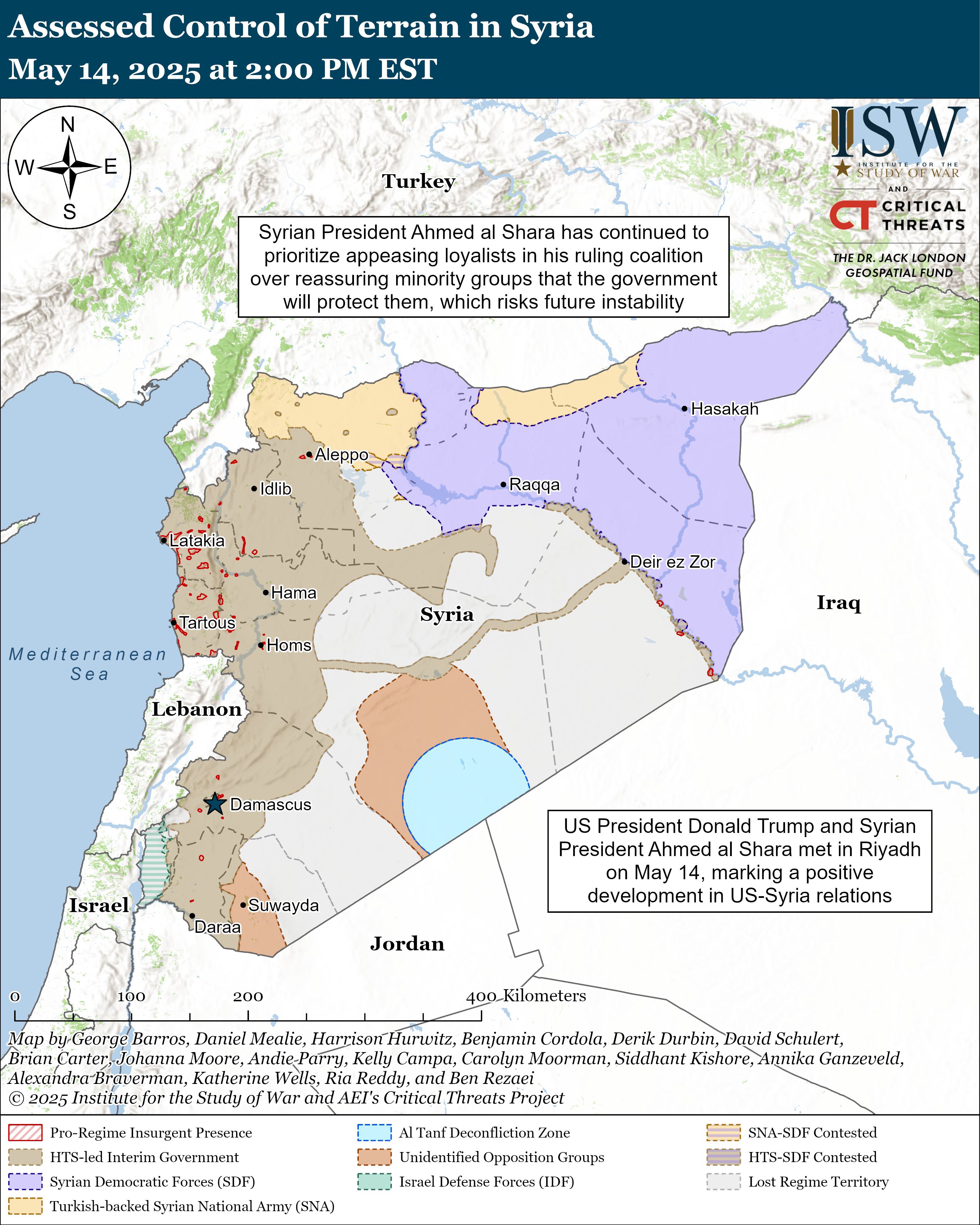 - Government Formation and Consolidation of Power in Syria: Syrian President Ahmed al Shara has continued to prioritize appeasing loyalists in his ruling coalition over reassuring minority groups that the government will protect them, which risks future instability. The Syrian Interior Ministry promoted Latakia Province General Security Service (GSS) Director Lieutenant Colonel Mustafa Knefati to commander of the Interior Ministry Special Forces on May 13. Knefati served as the Latakia Province GSS Director between December 2024 and May 2025, which included the spate of sectarian-motivated violence and insurgent activity in coastal Syria in March. Knefati, as the commander of forces that are accused of committing atrocities, bears responsibility for the actions of those forces and could be named in the report.