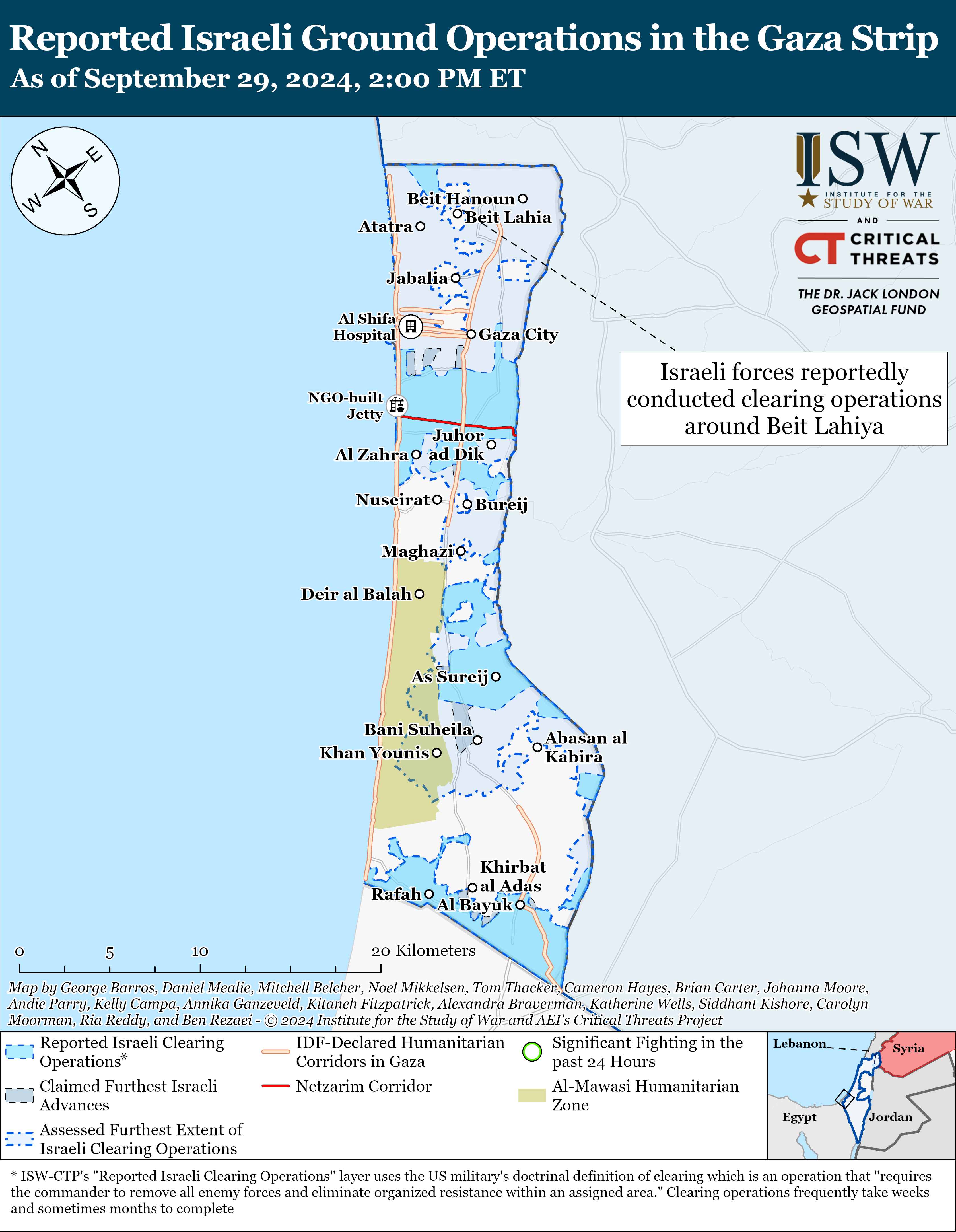 Israeli forces reportedly continued operating near Beit Lahiya in the northern Gaza Strip on September 29.[45] A Palestinian journalist reported gunfire from Israeli vehicles northwest of Beit Lahiya on September 29.[46] This reporting is consistent with the IDF launch of a precision operation in Beit Lahiya in order to destroy Hamas infrastructure on September 25.[47] Commercially available satellite imagery captured on September 27 shows flattened terrain and destroyed buildings west of Al Shafei Strawberry Farm in Beit Lahiya, indicating that Israeli tanks or bulldozers operated east of Beit Lahiya.