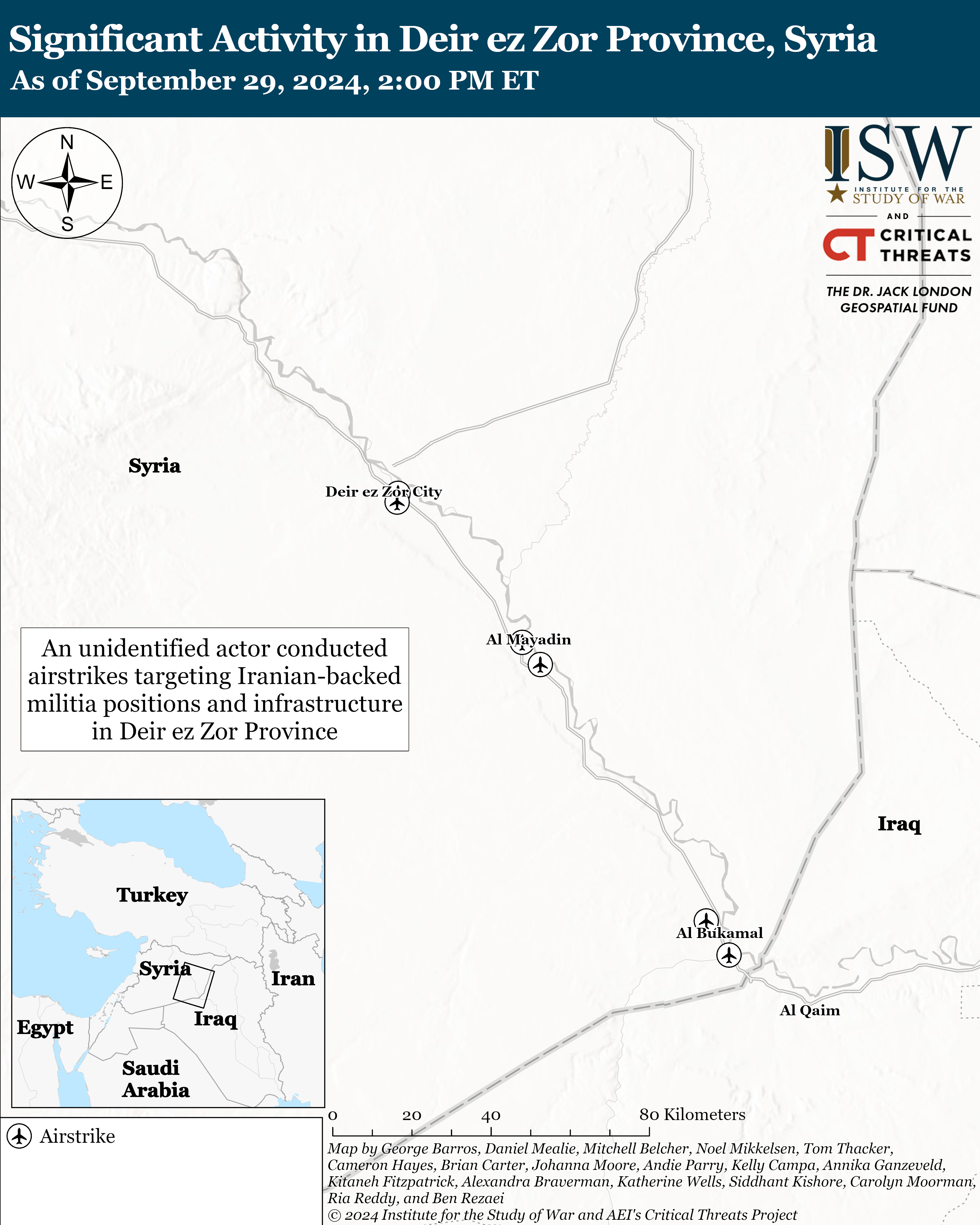 Syrian opposition media reported that an unspecified actor conducted airstrikes targeting Iranian-backed militia positions and infrastructure in Deir ez Zor Province, Syria, on September 28.[42] The airstrikes targeted bridges, militia positions, and a recently installed radar system around Albu Kamal and Deir ez Zor City.[43] Several militia members were killed or injured in the airstrikes, according to opposition reports.[44]