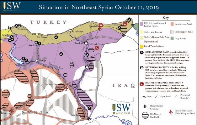 On October 9, 2019, Turkish military forces launched a new offensive into Northern Syria. Turkey’s assault is targeting an area that has been controlled by the Syrian Democratic Forces, a Syrian Kurdish-led group that is the primary U.S. partner in Syria in the counter-Islamic State of Iraq and al Sham (ISIS) campaign. The following Institute for the Study of War map depicts the situation on the ground as of October 11, 2019.