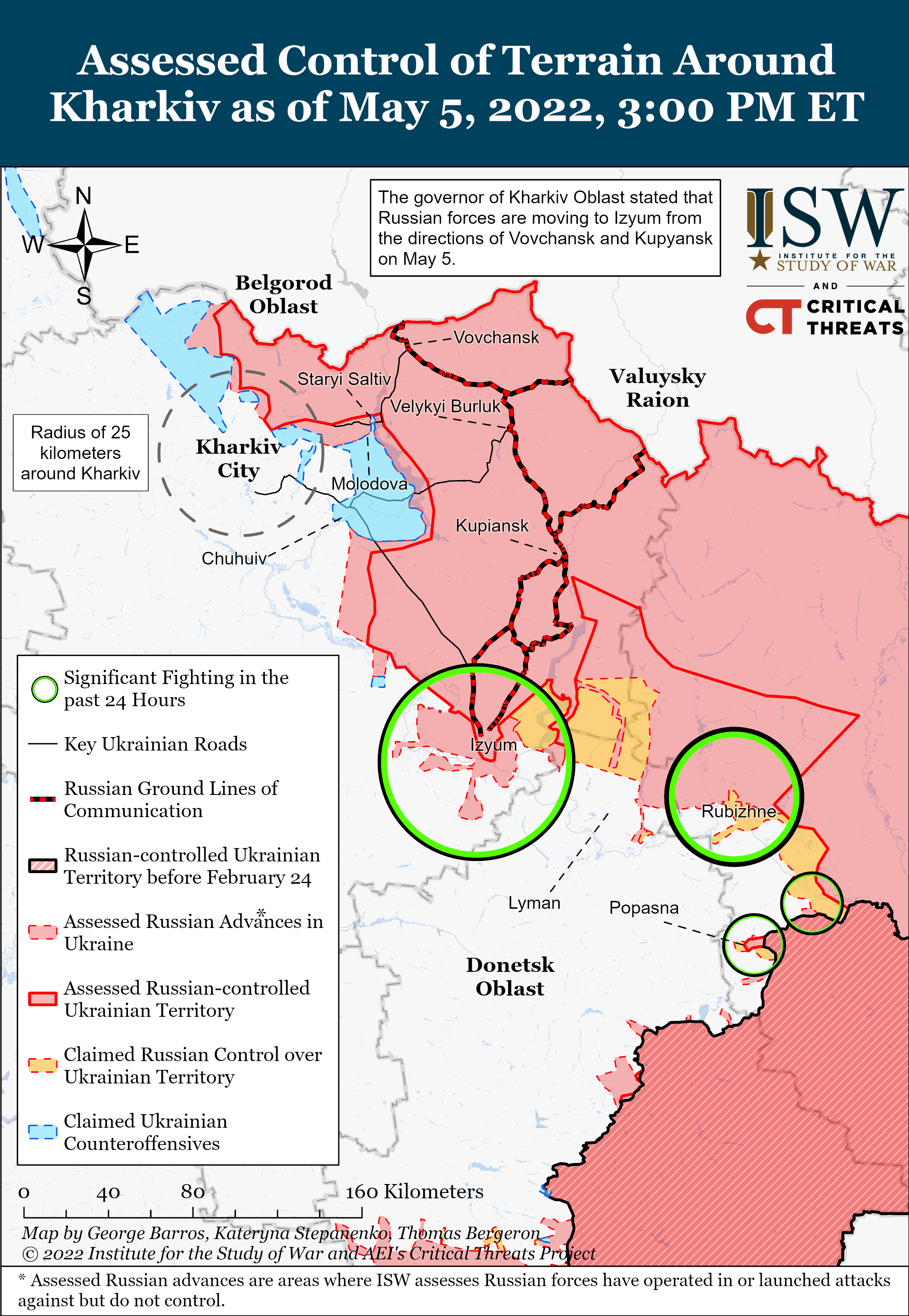 Ukrainian Commander-in-Chief Valerii Zalyzhnyi stated on May 5 that Ukrainian forces are transitioning to counteroffensive operations around Kharkiv and Izyum, the first direct Ukrainian military statement of a shift to offensive operations.[13] Ukrainian forces likely intend to push Russian forces out of artillery range of Kharkiv city, force Russian units to redeploy from the Izyum axis, and potentially threaten Russian lines of communication. Ukrainian forces did not make any confirmed advances in the last 24 hours but repelled Russian attempts to regain lost positions. The Ukrainian General Staff reported that Russian forces conducted an unsuccessful assault on Stary Saltiv (approximately 40 kilometers east of Kharkiv City) on May 5, after Ukrainian forces liberated the settlement on May 2.[14] Russian forces also reconnoitered Ukrainian positions and continued to shell Ukrainian positions in the northeastern outskirts of Kharkiv City.[15] Pro-Russian sources claimed that Ukrainian forces blew up a bridge near the occupied settlement of Cherkaski Tishki, approximately 25 kilometers northeast of Kharkiv City, which could indicate an ongoing Ukrainian counterattack in the area targeting the bridge to interdict Russian movements.[16]