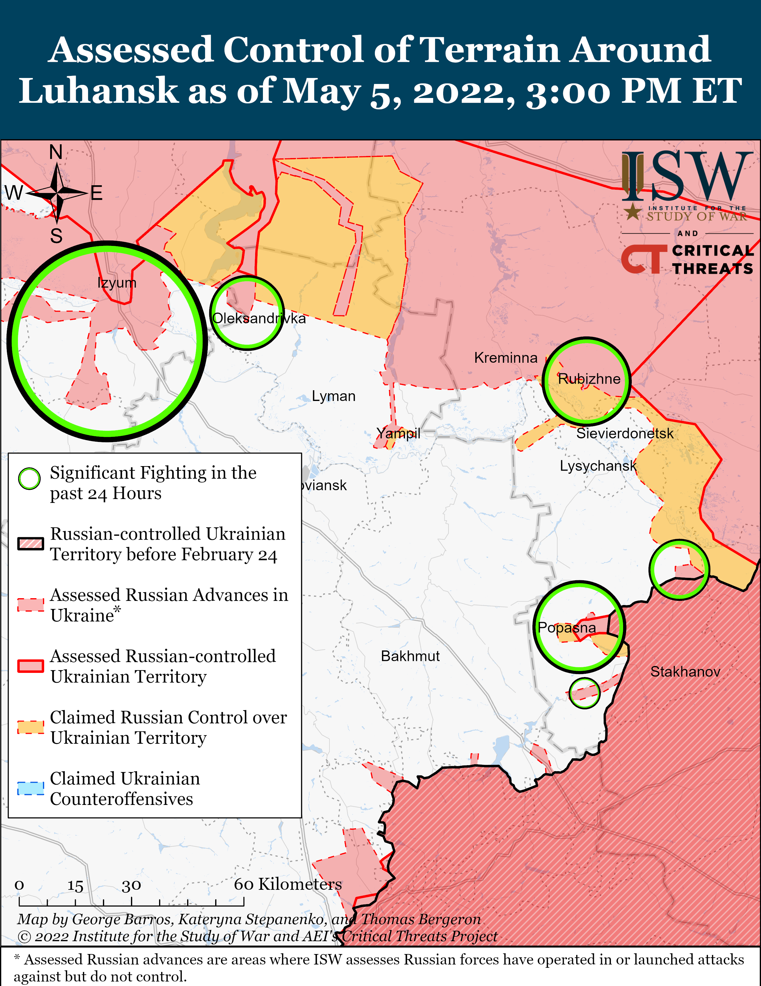 Russian forces continued ineffectual offensive operations in southern Kharkiv, Donetsk, and Luhansk Oblasts without securing any significant territorial gains in the past 24 hours. The Pentagon assessed that Russian forces have not been able to make further advances due to their inability to conduct offensive operations far from their ground lines of communication (GLOCs) along highways, as ISW previously assessed, and muddy terrain.[1] Russian GLOCs supporting the Izyum axis likely run from the Russian border to Kupyansk and Vovchansk, and local Kharkiv civilian authorities reported additional Russian reinforcements moving through these settlements towards the front line as of May 5.[2] Russian forces are reportedly suffering losses in stalled attacks along the Izyum axis, with the Ukrainian General Staff reporting that elements of the 4th Tank Division and the 106th Airborne Division withdrew to Russia after sustaining heavy losses in the past several days.[3]