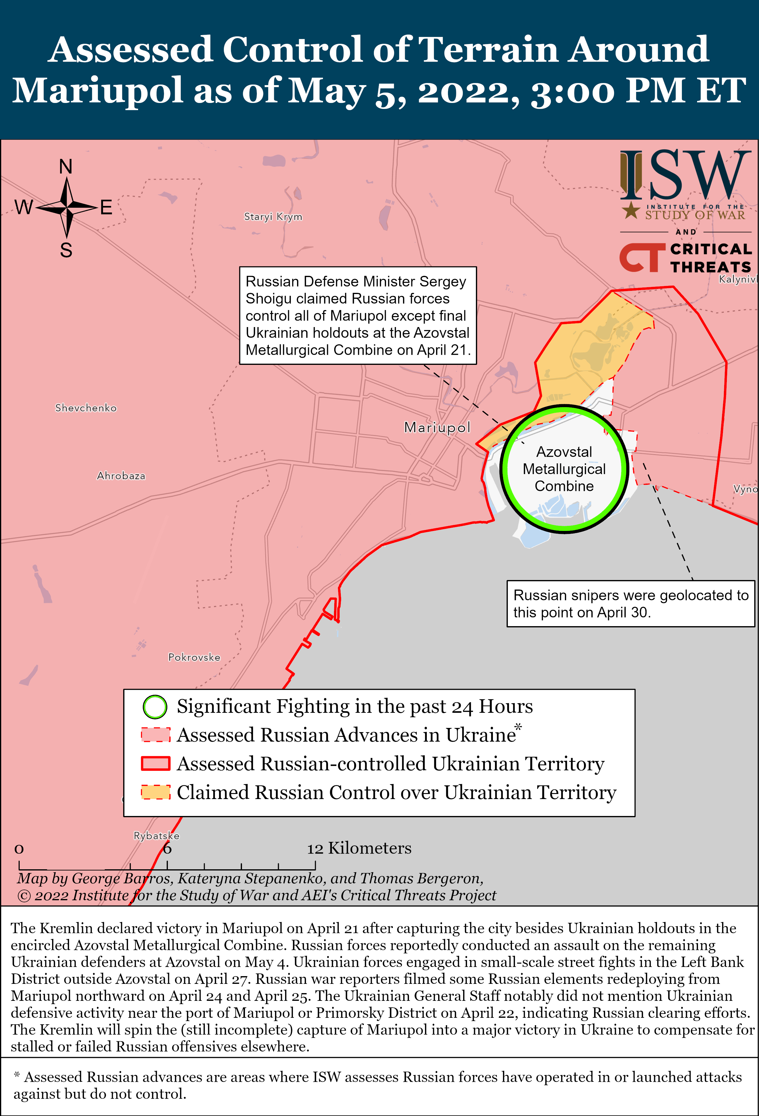 Russian forces continued assaults on the Azovstal Steel Plant with supporting airstrikes and naval artillery on May 5.[8] Ukrainian officials and military officers confirmed that Russian forces have breached the Azovstal facility itself and that Ukrainian forces are losing ground.[9] Azov Regiment Deputy Commander Svyatoslav Palamar released a video on Telegram reporting the current Russian assault began on May 3 and confirmed that Russian forces are inside the facility.[10] Palamar said the remaining defenders and civilians were unable to evacuate on May 5, despite reports from the Ukrainian government that Russian and Ukrainian forces agreed to a ceasefire in Mariupol between May 5 and May 7.[11] Ukrainian President Volodymyr Zelensky announced that 344 Mariupol residents, including over 150 evacuees from Azovstal, evacuated on May 4.[12] Russian forces will likely completely capture the Azovstal facility in the coming days, but Ukrainian forces have successfully tied down and degraded large numbers of Russian forces in Mariupol for several months.