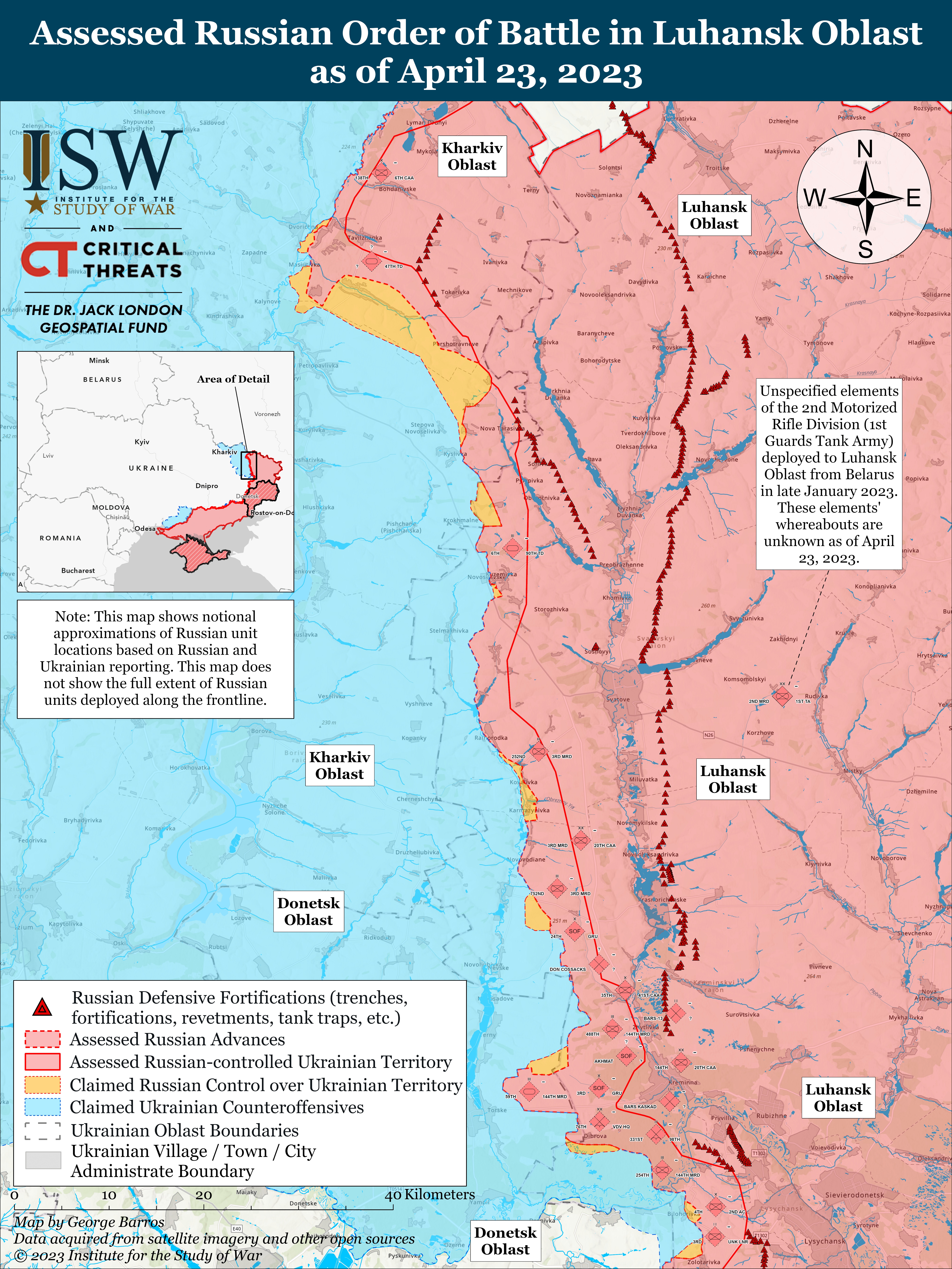 ISW is publishing a special edition campaign assessment today, April 23. This report outlines the current Russian order of battle (ORBAT) in Ukraine, assesses the offensive and defensive capabilities of Russian force groupings along the front, and discusses major factors that may complicate Russian defensive operations in the event of a Ukrainian counteroffensive.