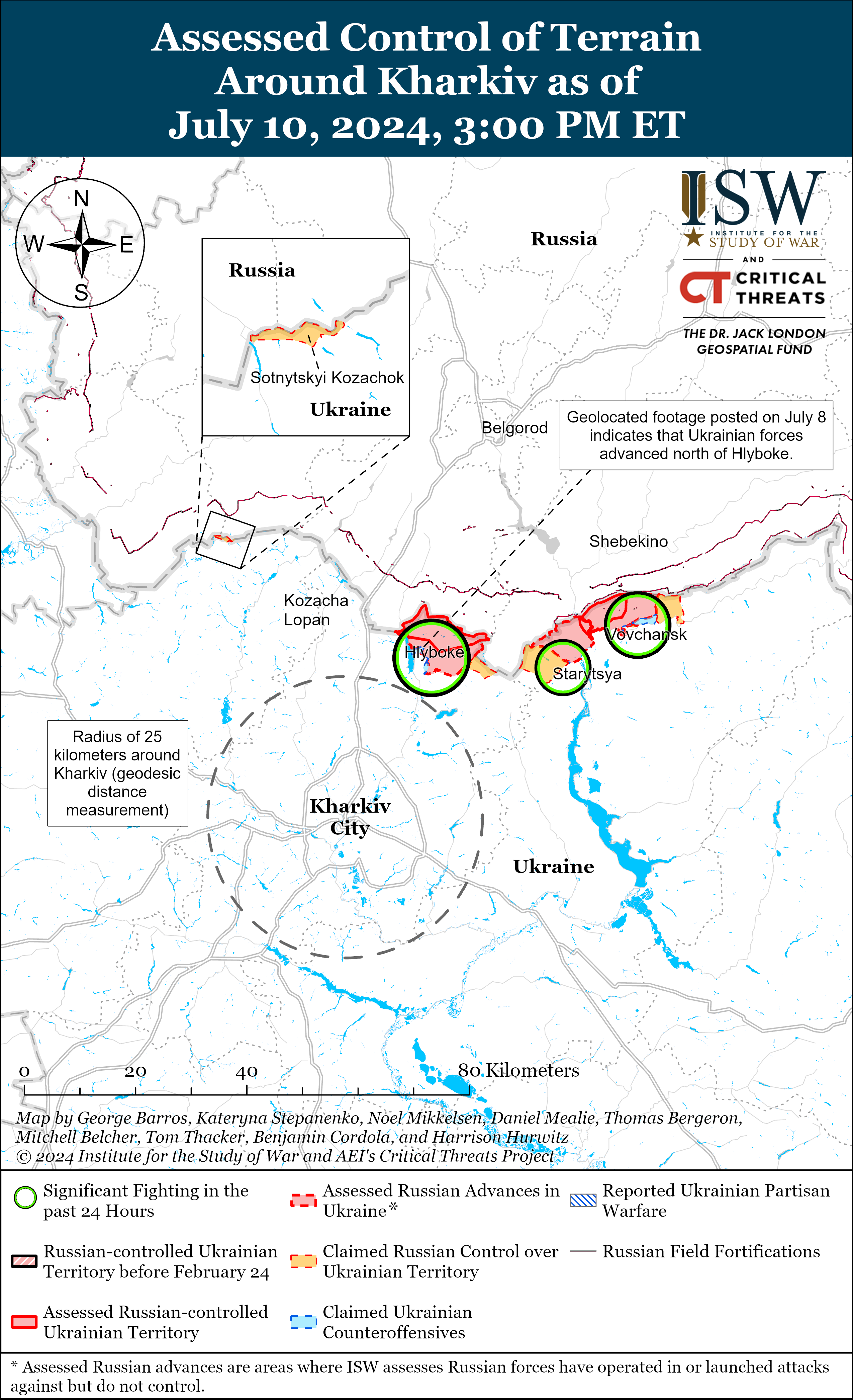 Ukrainian officials reported that Russian forces are attempting to sustain offensive operations in the Kharkiv direction despite heavy losses and a lack of progress. Ukrainian President Volodymyr Zelensky stated on July 9 that Ukrainian forces stopped the Russian offensive operation in Kharkiv Oblast in May and June and partially credited the US government for its recent permission for Ukraine to strike some military targets within Russia with US-provided weapons.[49] Ukrainian Kharkiv Group of Forces Chief of Staff Colonel Viktor Solimchuk stated that Russian forces are still attempting to create a “buffer zone” to conduct artillery strikes on Kharkiv City but that heavy Russian losses are complicating Russia’s ability to intensify offensive operations in the area.[50] Solimchuk stated that Russian forces are specifically concentrating on battles within Vovchansk and intensifying offensive operations in the direction of Lyptsi and Starytsya.[51] Solimchuk added that Russian forces in the area still have significant offensive potential and are currently regrouping, replenishing degraded forces, improving logistics, and training assault groups in the rear.[52] Solimchuk and Ukrainian Kharkiv Group of Forces Colonel Yuriy Povkh stated that Russian forces will continue efforts to probe Ukrainian defense elsewhere along the international border in northeastern Ukraine in an effort to fix Ukrainian forces along a wider front.[53] Povkh added that Russian forces are transferring additional engineering equipment to northern Kharkiv Oblast to construct and expand fortifications at recently seized positions and ISW has collected satellite imagery showing new Russian field fortifications in recently Russian-seized territories in northern Kharkiv Oblast.[54] Povkh and Solimchuk noted that Ukrainian forces lack the necessary air defense assets in the Kharkiv direction to sufficiently defend against the Russian aviation threat and that Russian forces launched almost 1,700 glide bombs in the Kharkiv direction between May 10 and July 8.[55]
