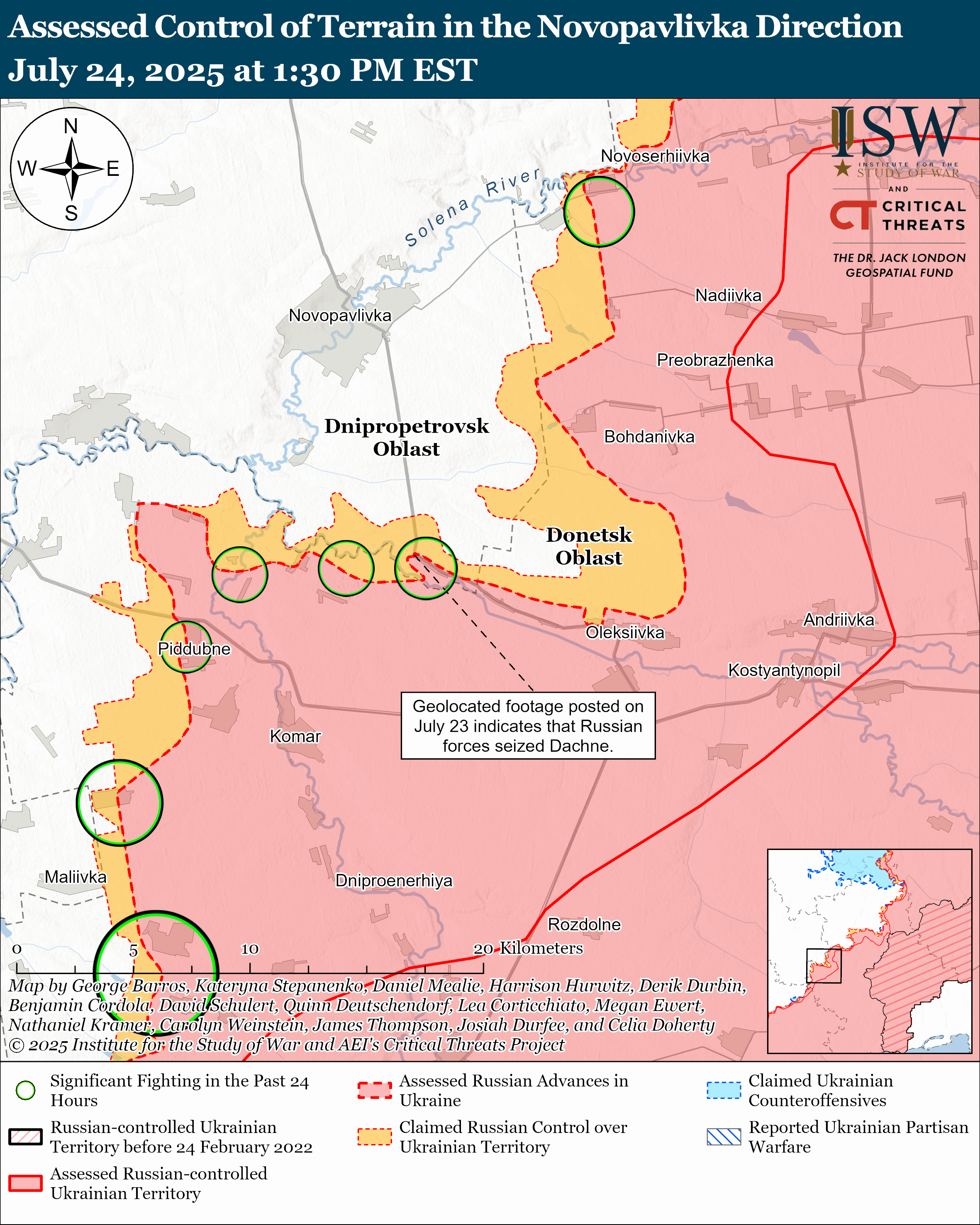 Assessed Russian advances: Geolocated footage published on July 23 indicates that Russian forces likely seized Dachne (south of Novopavlivka).[75]