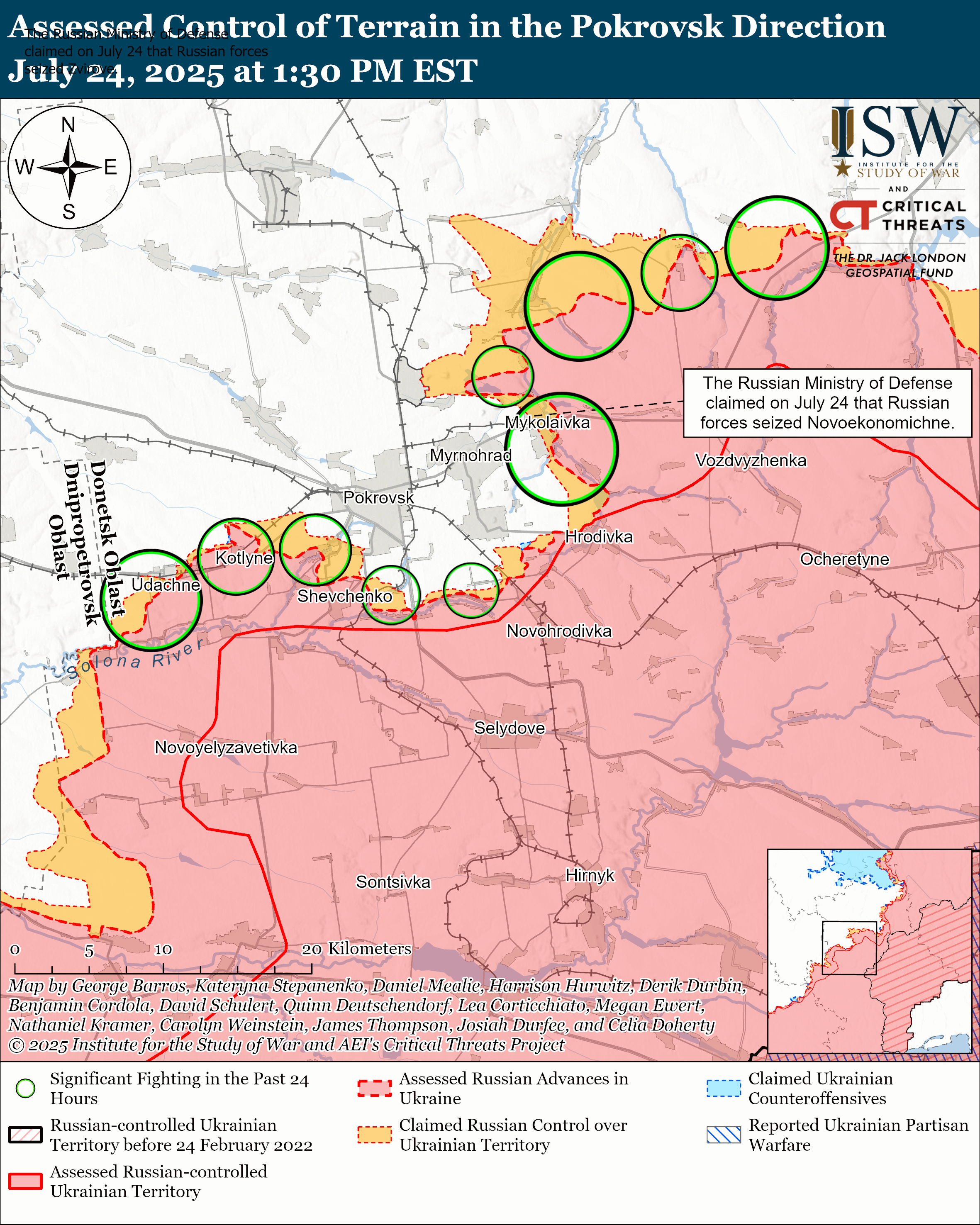 Ukrainian Khortytsia Group of Forces Spokesperson Colonel Viktor Trehubov stated on July 24 that over 100,000 Russian forces are operating in the Pokrovsk direction.[70] Trehubov stated that the Russian military command seeks to bypass Pokrovsk and Myrnohrad to the east and that Russian forces are renewing their efforts to advance west of Pokrovsk. An officer of a Ukrainian brigade operating in the Pokrovsk direction stated on July 24 that Russian forces are using more motorcycles due to a fear of using armored vehicles.[71] The spokesperson of a different Ukrainian brigade operating in the Pokrovsk direction stated that Russian forces are moving in groups of two to four personnel along windbreaks for ground assaults.[72]