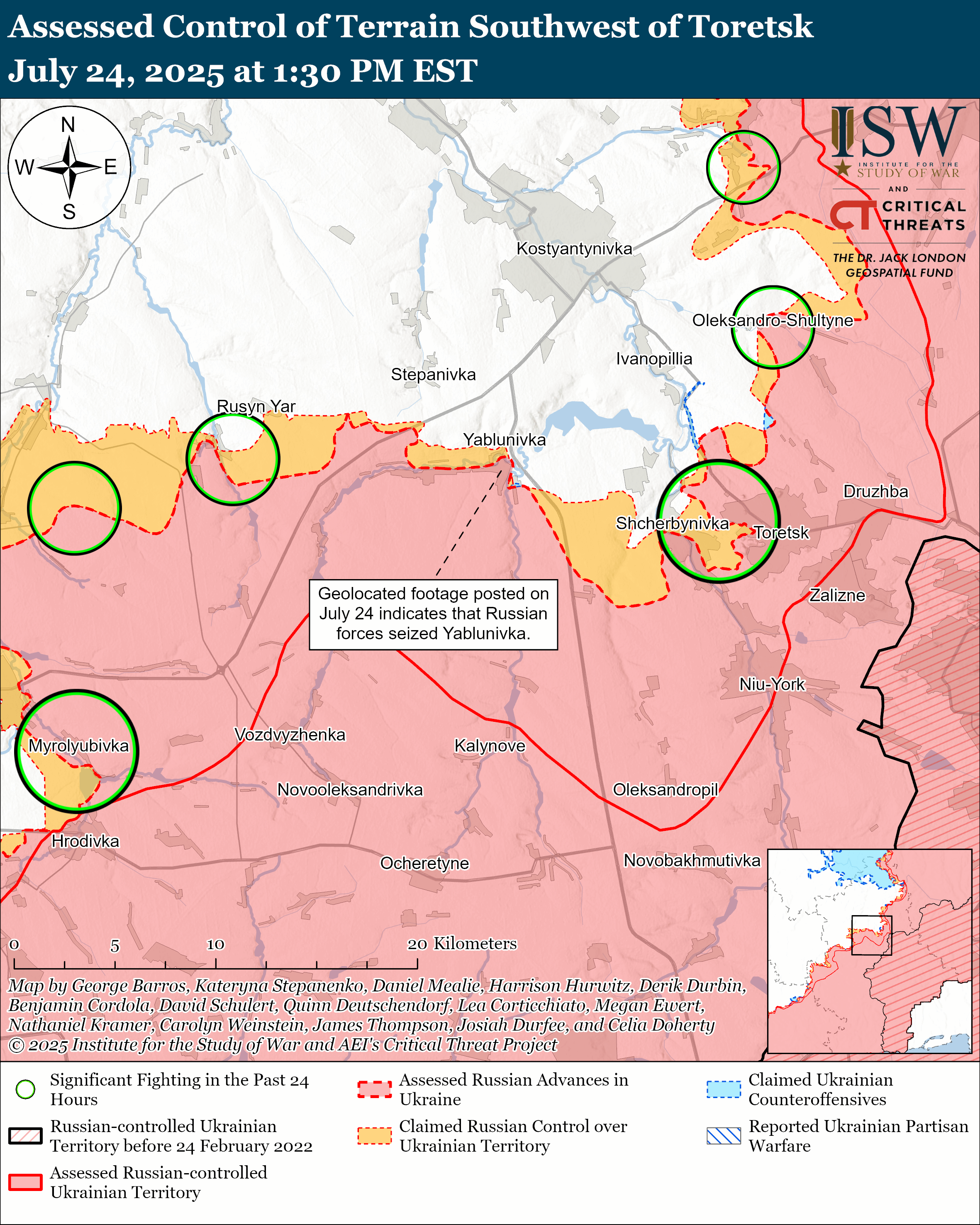 Assessed Russian advances: Geolocated footage published on July 24 shows Russian forces raising a flag in eastern Yablunivka (northwest of Toretsk), indicating that Russian forces likely seized the settlement.[59] A Russian milblogger credited elements of the Russian 33rd Motorized Rifle Regiment (20th Motorized Rifle Division, 8th CAA, SMD) with seizing the settlement.[60]