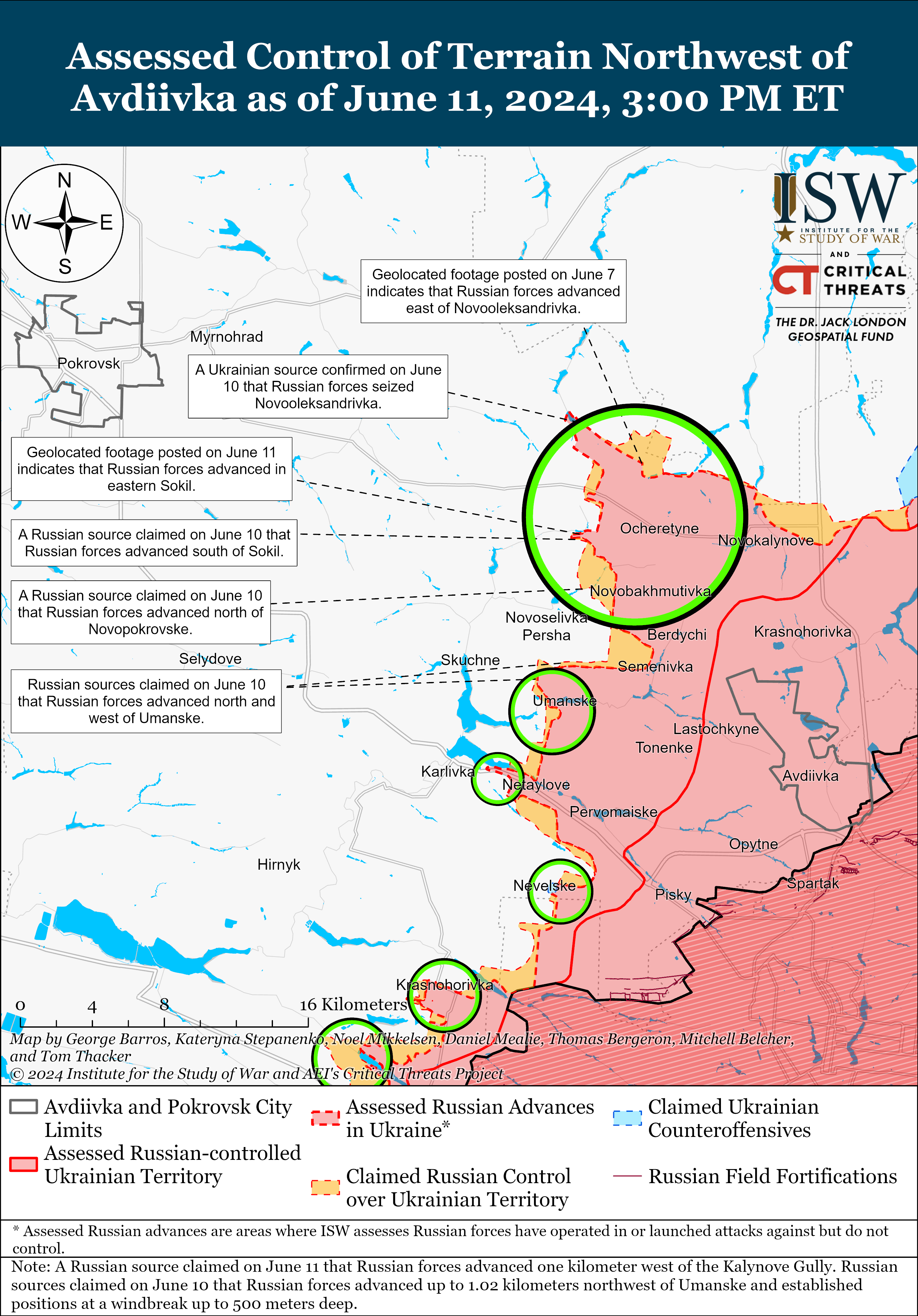 Russian forces recently advanced northwest of Avdiivka amid continued offensive operations in the area on June 11. Geolocated footage published on June 11 indicates that Russian forces recently marginally advanced on the northeastern outskirts of Sokil (northwest of Avdiivka).[44] Mashovets stated that elements of the Russian 30th Motorized Rifle Brigade, (2nd CAA, Central Military District [CMD]), 35th Motorized Rifle Brigade (41st CAA, CMD), and the 433rd Motorized Rifle Regiment (27th Motorized Rifle Division, 2nd CAA, CMD) seized Novooleksandriivka (northwest of Avdiivka) and Russian milbloggers made similar claims, indicating that Russian forces have likely seized the settlement.[45] One Russian milblogger claimed that Ukrainian forces maintain positions in western Novooleksandriivka, however.[46] Russian milbloggers claimed that elements of the Russian 228th Motorized Rifle Regiment (90th Tank Division, 41st CAA, CMD) advanced to the eastern outskirts of Novopokrovske (northwest of Avdiivka and south of Novooleksandrivka) and that Russian forces advanced to the outskirts of Yasnobrodivka (west of Avdiivka), from Umanske (west of Avdiivka) towards Novoselivka Persha (northwest of Avdiivka), and in the dacha area on the outskirts of Karlivka (southwest of Avdiivka).[47] Mashovets warned that Russian forces could make more significant advances in the Pokrovsk (Avdiivka) direction if the Russian military command transfers additional forces to this direction.[48] The Ukrainian General Staff reported that Russian forces also continued attacks near Yevhenivka (northwest of Avdiivka) and Kalynove (southwest of Avdiivka) on the evening of June 10.[49] Elements of the “Somalia” Assault Battalion (1st DNR AC) are reportedly operating near Karlivka.[50]