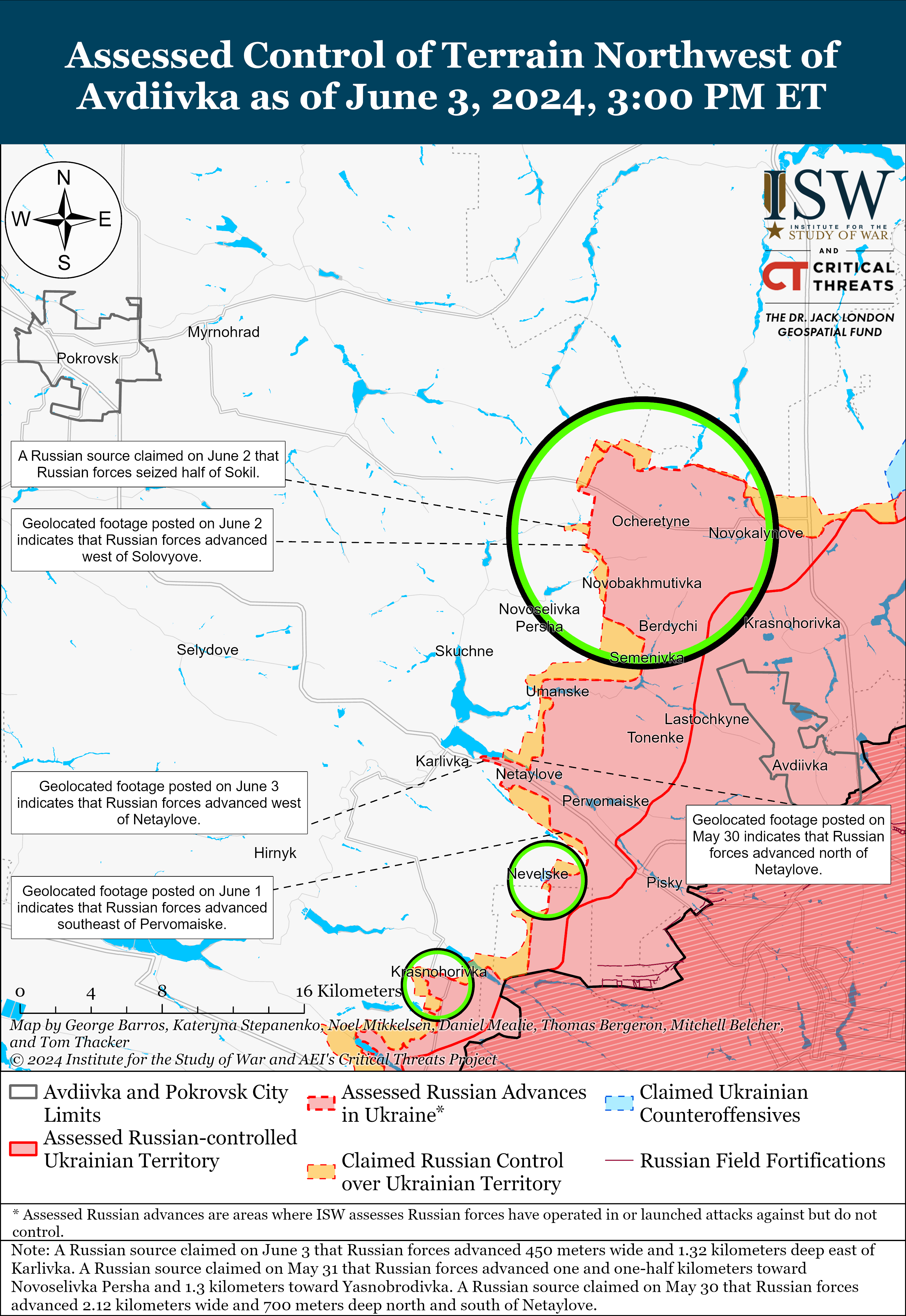 Geolocated footage published on June 3 shows that Russian forces have advanced along the M-30 highway west of Netaylove (west of Avdiivka) approaching Karlivka, and Russian milbloggers claimed that Russian forces advanced 450 meters wide and 1.32 kilometers deep east of Karlivka and into the nearby Volna-1 holiday village.[58] Russian milbloggers claimed that Russian forces seized a garden area south of Netaylove, advanced west of the Berdychi-Orlivka line towards Skuchne (all west of Avdiivka), and advanced north and northwest of Arkhanhelske (northwest of Avdiivka).[59] Some Russian milbloggers claimed that Russian forces have advanced to at least the outskirts of Sokil (northwest of Avdiivka), and some milbloggers claimed that Russian forces managed to advance as far as central Sokil, but one milblogger claimed that these reports are unconfirmed.[60] ISW has not observed any indications that Russian forces have entered Sokil at this time. Ukrainian Khortytsia Group of Forces Spokesperson Lieutenant Colonel Nazar Voloshyn stated that Russian forces are currently focusing on breaking through Ukrainian positions in small areas of the front between Staromykhailivka (immediately west of Donetsk City) and Berdychi (northwest of Avdiivka) to set conditions for further offensive operations west towards Pokrovsk.[61] Fighting also continued northwest of Avdiivka near Novooleksandrivka, Zelene Pole, Ocheretyne, Novopokrovske, Novoselivka Persha, and Kalynove; west of Avdiivka near Umanske and Yasnobrodivka; and southwest of Avdiivka near Nevelske on June 2 and 3.[62] The Ukrainian General Staff also reported that Russian forces attacked near Ptyche (west of Umanske across the Vovcha River), likely referring to the general direction and not the immediate area around the settlement, as ISW has observed no indicators that Russian forces are even close to crossing the Vovcha River in this area.[63] Elements of the Russian 30th Motorized Rifle Brigade (2nd Combined Arms Army [CAA], Central Military District [CMD]) are reportedly fighting near Sokil.[64] Ukrainian military observer Kostyantyn Mashovets reported that elements of the Russian 1st and 9th motorized rifle brigades (both of the 1st Donetsk People’s Republic [DNR] AC) are fighting near Netaylove and that elements of the 110th Motorized Rifle Brigade (1st DNR AC) are fighting east and southeast of Nevelske.[65]