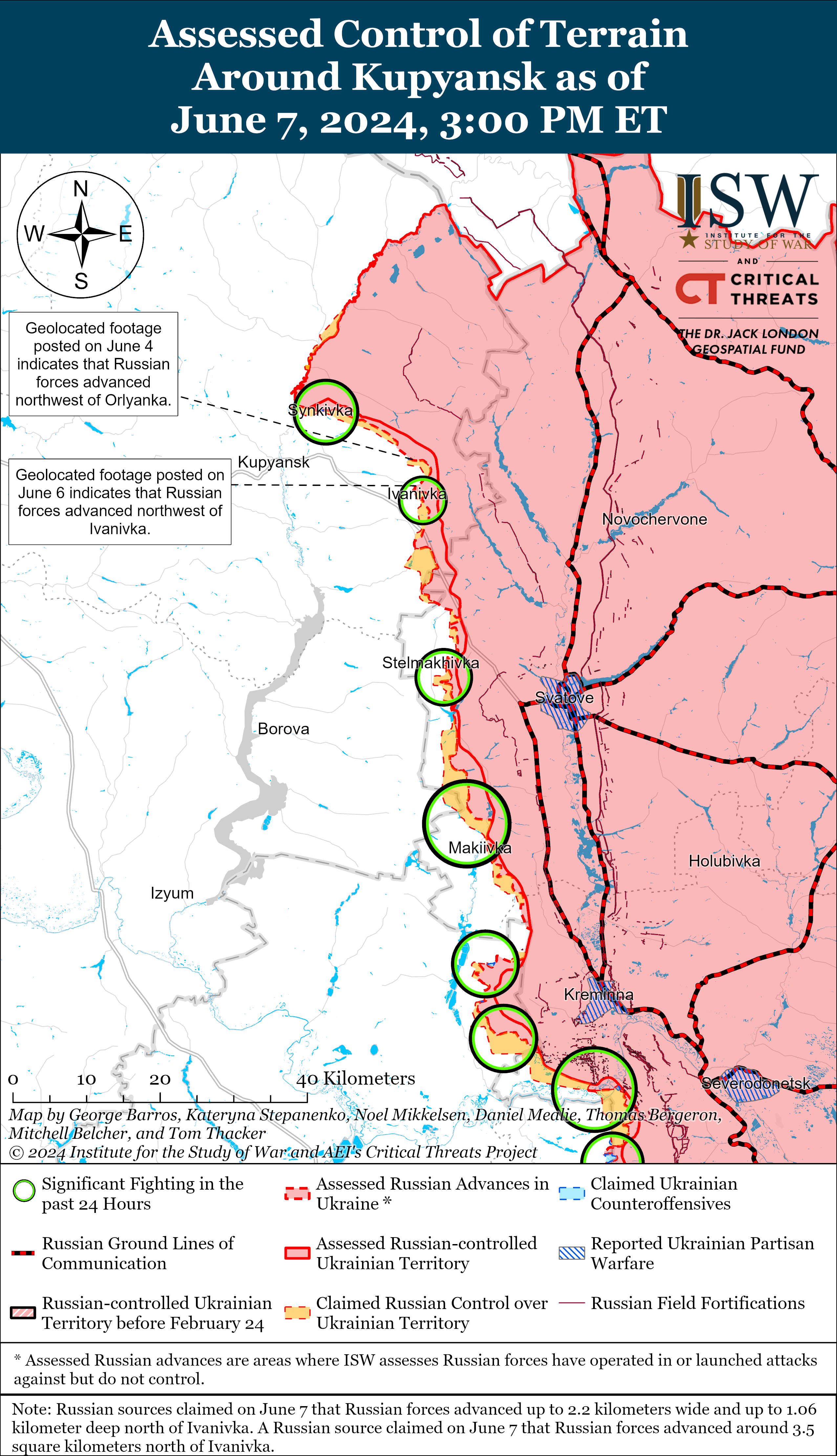 Russian forces recently advanced northwest of Svatove amid continued Russian offensive operations along the Kupyansk-Svatove line on June 7. Geolocated footage published on June 6 indicates that Russian forces recently advanced northwest of Ivanivka (northwest of Svatove), although ISW has yet to observe confirmation that Russian forces have seized Ivanivka, as Russian milbloggers have claimed.[73] Russian milbloggers claimed that Russian forces advanced further west of Ivanivka and along a front up to 2.2 kilometers wide and up to three kilometers deep north of the settlement, although ISW has not observed confirmation of these claims.[74] A Russian milblogger claimed that Ukrainian minefields are slowing Russian advances in the Ivanivka area.[75] Geolocated footage published on June 4 indicates that Russian forces previously advanced near Orlyanka (northwest of Svatove), but Russian forces likely made these gains over Winter 2023-2024.[76] Russian forces continued offensive operations northeast of Kupyansk near Synkivka; east of Kupyansk near Petropavlivka; northwest of Svatove near Pishchane and Ivanivka; west of Svatove near Myasozharivka; and southwest of Svatove near Druzhelyubivka and Hrekivka on June 6 and 7.[77] The deputy commander of a Ukrainian brigade operating in the Kupyansk direction stated that Ukrainian forces repelled a roughly platoon-sized or greater Russian mechanized assault and destroyed four Russian BMP infantry fighting vehicles in the Kupyansk direction on June 6.[78] Kupyansk City Military Administration Head Andriy Kanashevich stated on June 7 that Russian strikes are complicating Ukrainian logistics across the Oskil River, and footage posted on June 7 shows Russian forces striking a bridge over the Oskil near Kruhlyakivka (northwest of Svatove) on June 5.[79] Russian forces have routinely struck Ukraine-controlled crossings across the Oskil River in an effort to isolate the battlespace on the east bank of the Oskil River, although Ukrainian forces have not yet shown any signs of serious difficulties in supplying positions on the east bank of the Oskil River.[80]