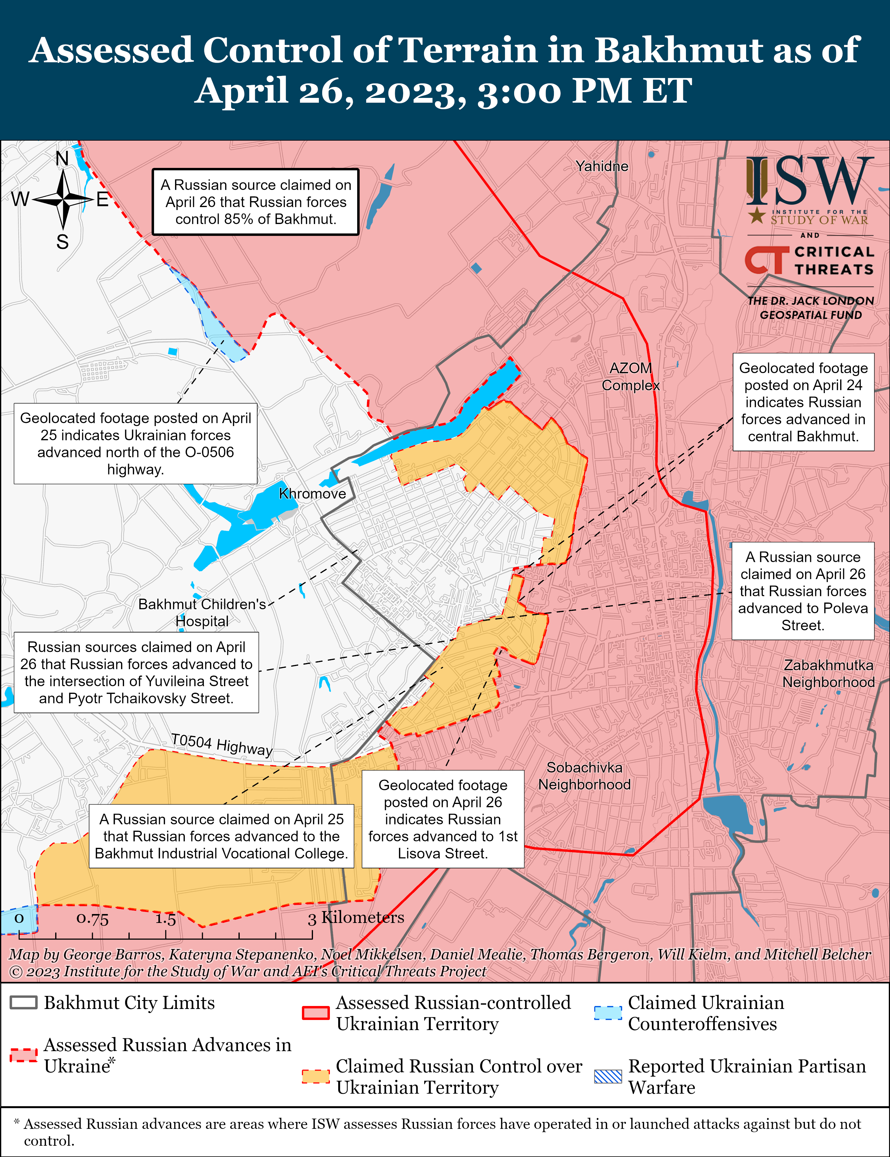 Russian forces continued making gains in Bakhmut as of April 26. Geolocated footage posted on April 26 shows that Russian troops have advanced to Persha Lisova Street in western Bakhmut (within a few blocks of the Yuvileina 00506 road that runs into Khromove).[34] Russian milbloggers additionally claimed that Wagner fighters reached the intersection of Tchaikovskyi and Yuvileina Streets, which would hypothetically allow them to advance up Yuvileina Street towards Khromove and cut remaining Ukrainian logistics lines into Bakhmut.[35] Wagner Group financier Yevgeny Prigozhin denied these claims, however, and played down the significance of Wagner’s capture of that intersection, stating that Ukrainian forces are continuing to use roads under Wagner’s fire control anyways.[36] Russian milbloggers claimed that Wagner is continuing to fight in northern, western, and southern Bakhmut.[37] One Russian milblogger claimed that Wagner controls up to 85 percent of the city, which is consistent with ISW’s control of terrain calculations including territory covered by Russian claims.[38] Ukrainian Eastern Group of Forces Spokesperson Colonel Serhiy Cherevaty stated that Russian and Ukrainian forces engaged in 17 combat clashes in the Bakhmut direction over the past day.[39] The Ukrainian General Staff reported that Russian troops conducted unsuccessful offensive actions northwest of Bakhmut near Orikhovo-Vasylivka (10km northwest) and Bohdanivka (6km northwest); west of Bakhmut near Ivanivske (5km west) and Khromove (3km west); and southwest of Bakhmut near Klishchiivka (7km southwest).[40]