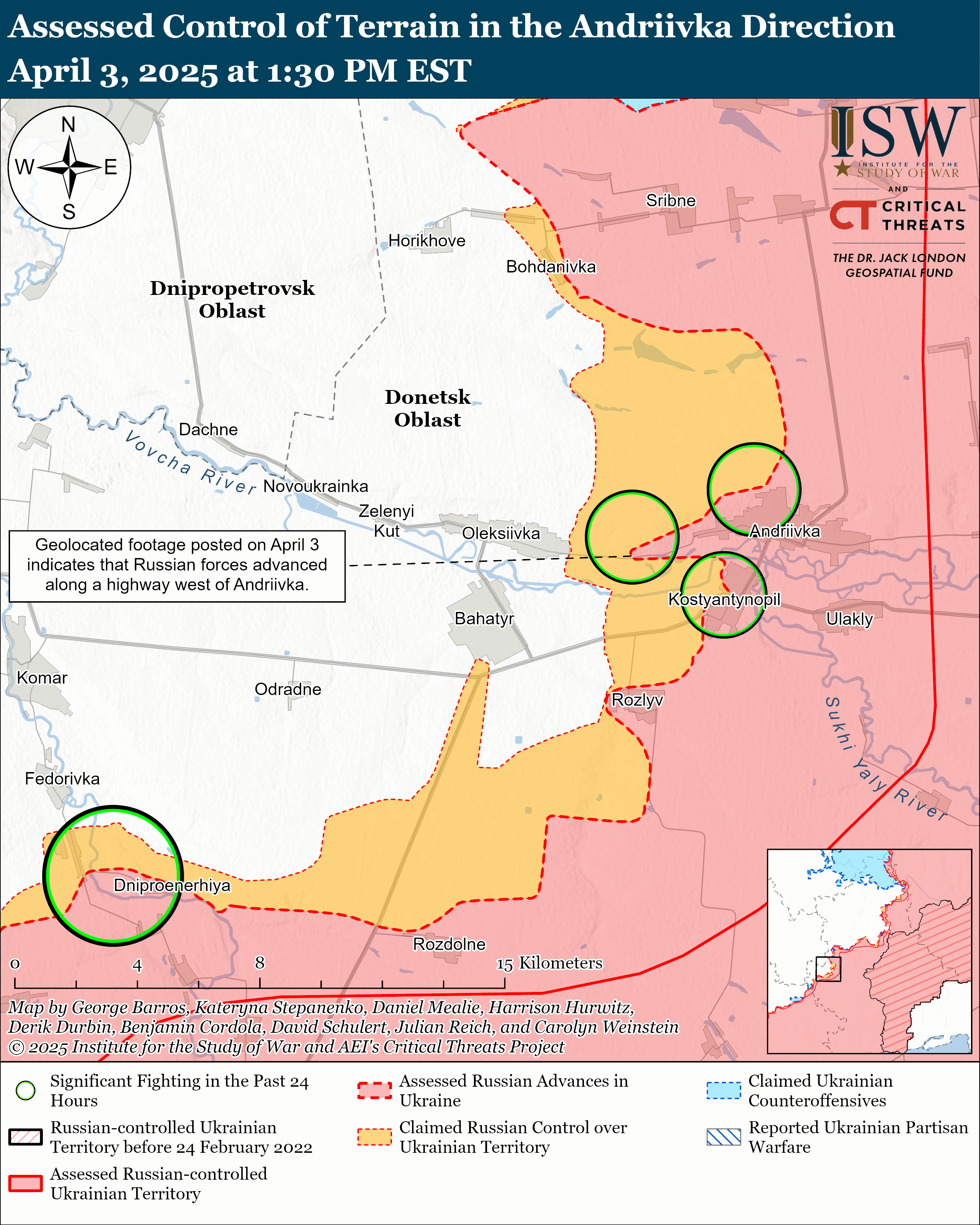 Russian forces attacked northeast of Pokrovsk near Tarasivka; east of Pokrovsk near Yelyzavetivka, Vodyane Druhe, and Promin; south of Pokrovsk near Zelene and Vidrodzhennya (formerly Novyi Trud); and southwest of Pokrovsk near Udachne, Novoserhiivka, Nadiivka, Uspenivka, Kotlyne, Novoukrainka, Kotlyarivka, Sukha Balka, and Bohdanivka and toward Muravka on April 2 and 3.[46] Russian milbloggers claimed that Ukrainian forces counterattacked near Solone (southwest of Pokrovsk) and that Solone is a contested “gray zone.”[47]