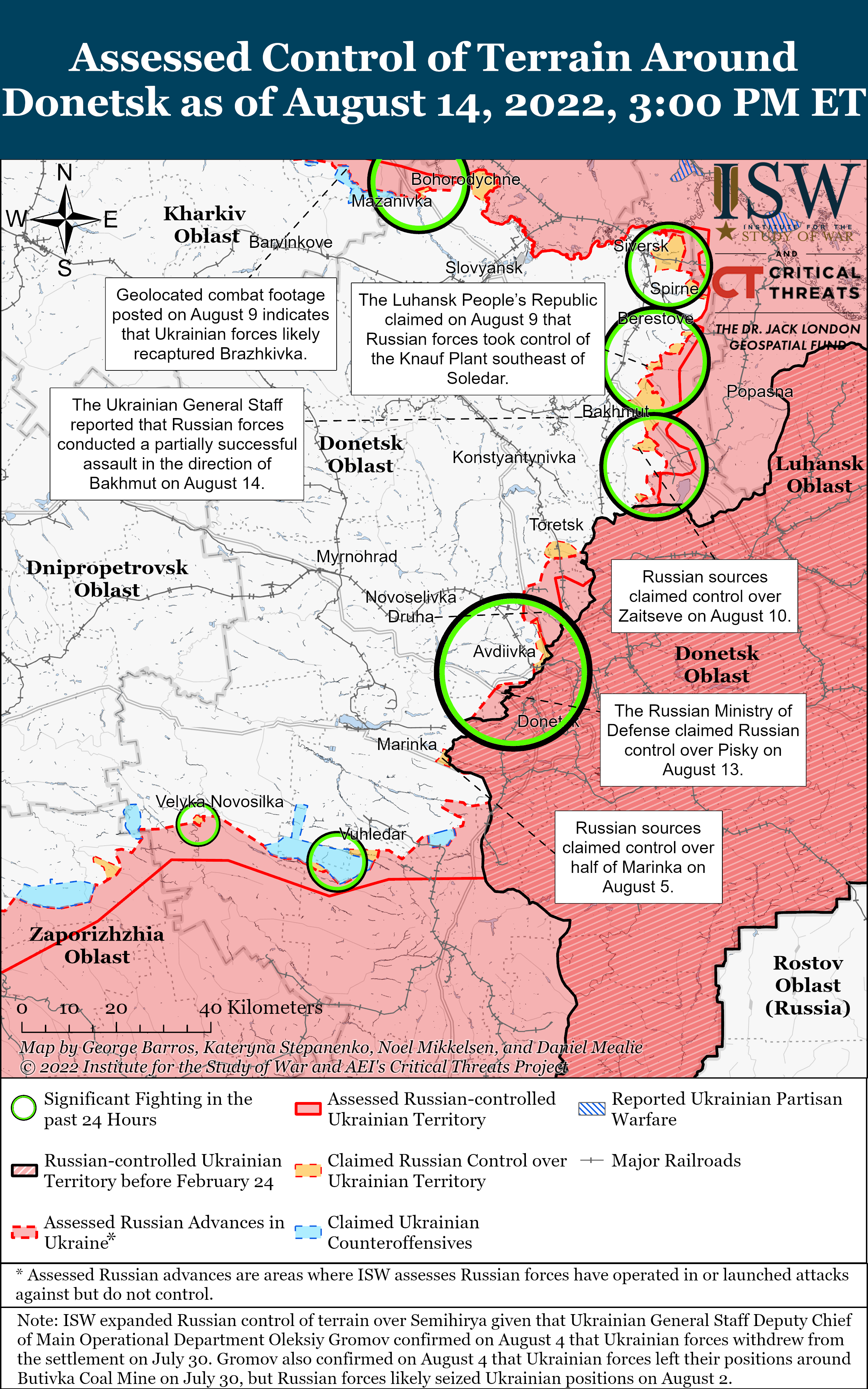 Russian forces continued ground attacks east and south of Bakhmut and made partial gains in this area on August 14. The Ukrainian General Staff stated that Russian forces had “partial success” in the direction of Bakhmut, but offered no specifics.[33] Russian forces reportedly fought around Soledar and Yakovlivka, both within 15km northeast of Bakhmut along the T1302 Bakhmut-Lysychansk highway.[34] Russian forces also continued fighting southeast of Bakhmut around Vershyna (15km southeast of Bakhmut), Kodema (20km southeast of Bakhmut), and Zaitseve (10km southeast of Bakhmut).[35] Russian sources claimed that Russian troops are advancing from positions in Vershyna towards the outskirts of Zaitseve and will continue to push north towards Bakhmut from Zaitseve.[36]