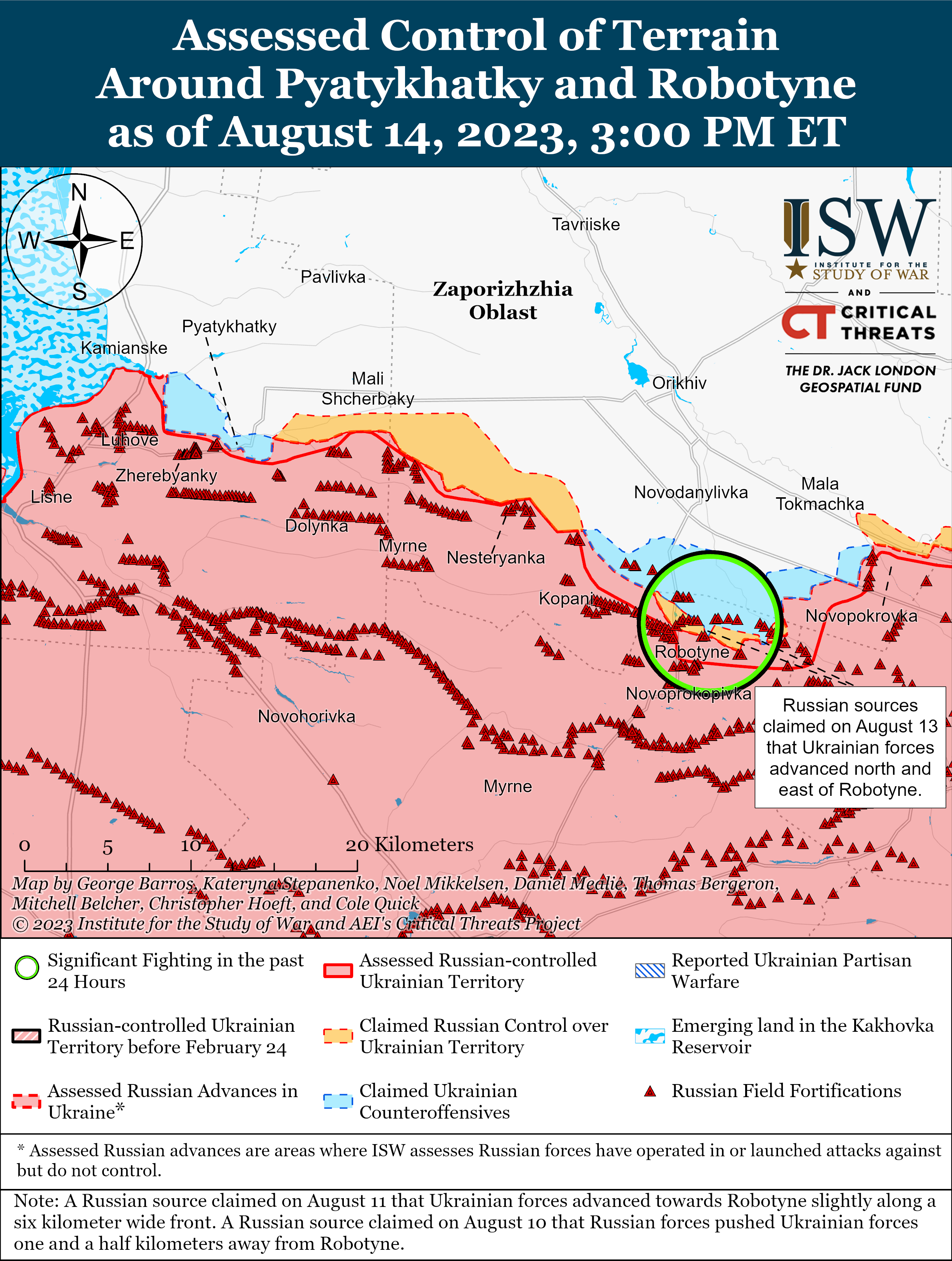 Ukrainian forces conducted offensive operations in western Zaporizhia Oblast on August 14, but did not make confirmed or claimed advances. The Ukrainian General Staff reported that Ukrainian forces continued offensive operations in the Melitopol direction (western Zaporizhia Oblast).[51] The Russian MoD and other Russian sources claimed that Russian forces repelled small Ukrainian attacks near Robotyne (13km south of Orikhiv).[52] A Russian milblogger claimed that elements of the 56th VDV Regiment (7th Guards Mountain VDV Division) repelled Ukrainian attacks in the Orikhiv direction.[53]