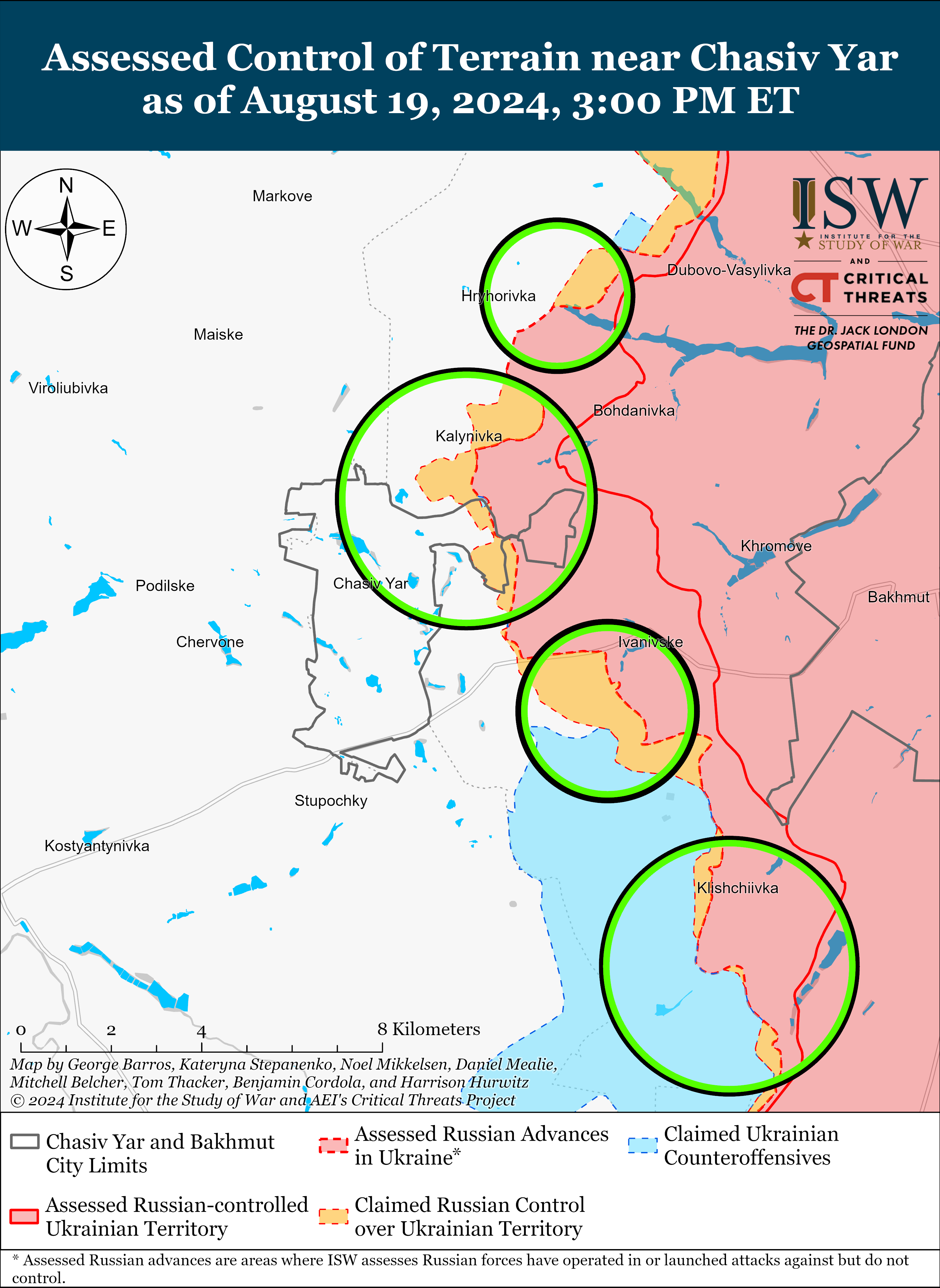 Russian forces reportedly advanced within Chasiv Yar on August 19, although there were no confirmed changes to the frontline. A Russian milblogger claimed that Russian forces seized and cleared a Ukrainian fortification east of the Zhovtnevyi Miroraion in eastern Chasiv Yar, although ISW has not yet observed visual evidence of this claim.[45] The Ukrainian General Staff reported that fighting continued northeast of Chasiv Yar near Hryhorivka and Kalynivka; east of Chasiv Yar near Ivanivske; southeast of Chasiv Yar near Andriivka and Klishchiivka; and south of Chasiv Yar near Predtechnye and Stupochky.[46] Elements of the Russian 98th Airborne (VDV) Division are reportedly operating near the Siverskyi-Donets Donbas Canal in eastern Chasiv Yar.[47]