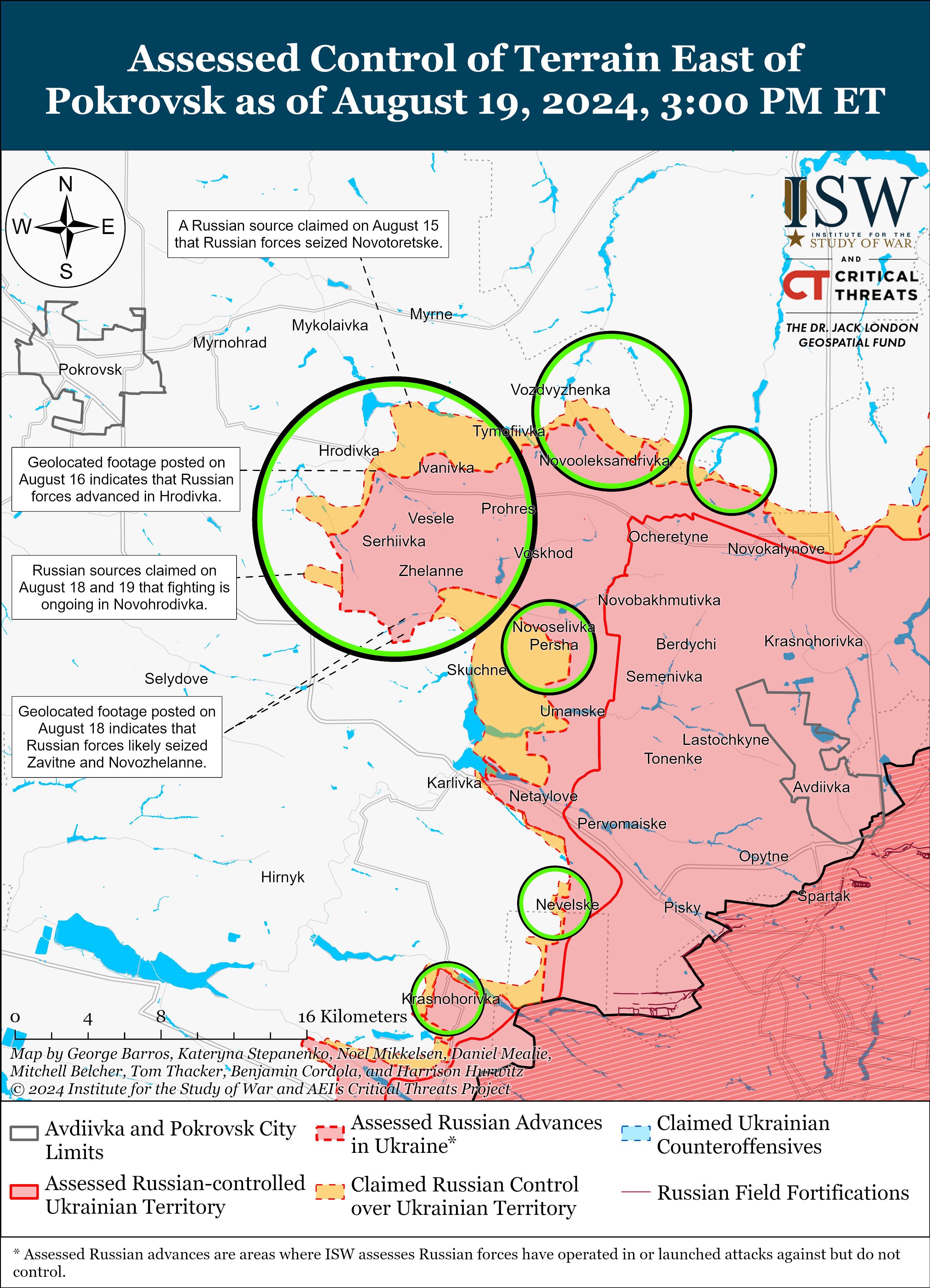 Russian forces recently advanced southeast of Pokrovsk and continued offensive operations towards Pokrovsk on August 19. Geolocated footage published on August 18 showing a Russian flag in southern Zavitne (southeast of Pokrovsk) indicates that Russian forces recently seized Zavitne and Novozhelanne (just north of Zavitne).[53] Russian milbloggers reported that Russian forces are advancing towards Komyshivka and Ptychne (southeast of Pokrovsk and just southeast of the Novozhelanne-Komyshivka area) and that Ukrainian forces are withdrawing from these settlements to avoid tactical encirclement.[54] Some Russian milbloggers also claimed that Russian forces have reached the outskirts of Hrodivka and Novohrodivka (east and southeast of Pokrovsk, respectively), but ISW has not observed visual confirmation of Russian troops in either of these settlements.[55] The Ukrainian General Staff reported that Russian forces attacked northeast of Pokrovsk near Vozdvyzhenka, Zelene Pole, Kalynove, and Myrolyubivka and southeast of Pokrovsk near Mykolaivka, Ptychne, Novohrodivka, Zavitne, and Skuchne.[56]
