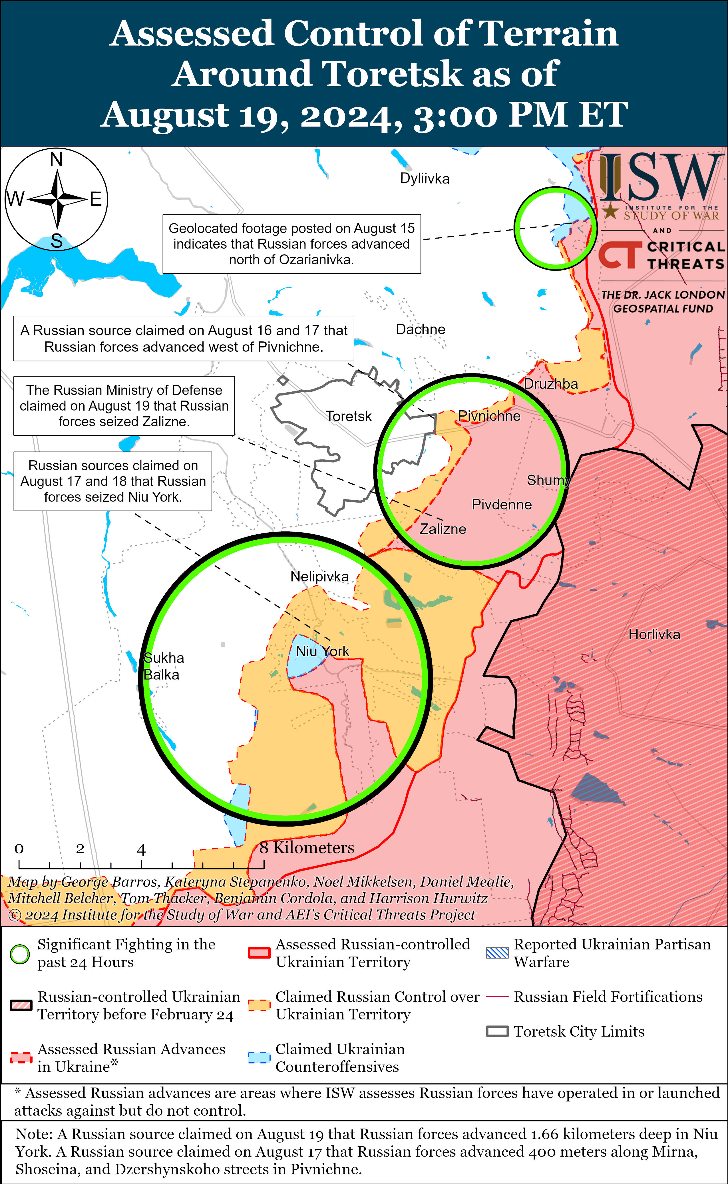 Russian forces reportedly continued to advance in the Toretsk direction on August 19. The Russian Ministry of Defense (MoD) claimed on August 19 that elements of the Russian Central Grouping of Forces seized Zalizne (southeast of Toretsk), and a prominent milblogger claimed that Russian forces also advanced through the electrical substation west of Zalizne and are moving towards Nelipivka (southwest of Zalizne and south of Toretsk).[48] Several Russian milbloggers additionally claimed that Russian forces seized all of Niu York (south of Toretsk) and are clearing positions in the northern part of the settlement in order to attack northwards towards Nelipivka, supporting efforts to move towards Nelipivka from western Zalizne.[49] Some Russian milbloggers also claimed that Russian forces have advanced into southern Nelipivka and are consolidating new positions in the settlement.[50] ISW has not yet observed visual confirmation of any of these Russian claims, however, and still does not have visual evidence confirming that Russian forces control all of Niu-York. The Ukrainian General Staff stated that Russian forces attacked near Nelipivka, which may suggest that Russian forces have advanced closer to Nelipivka either via Niu York or Zalizne.[51] The Ukrainian General Staff also reported fighting near Toretsk itself, as well as near Niu York, Zalizne, and Nelipivka.[52]