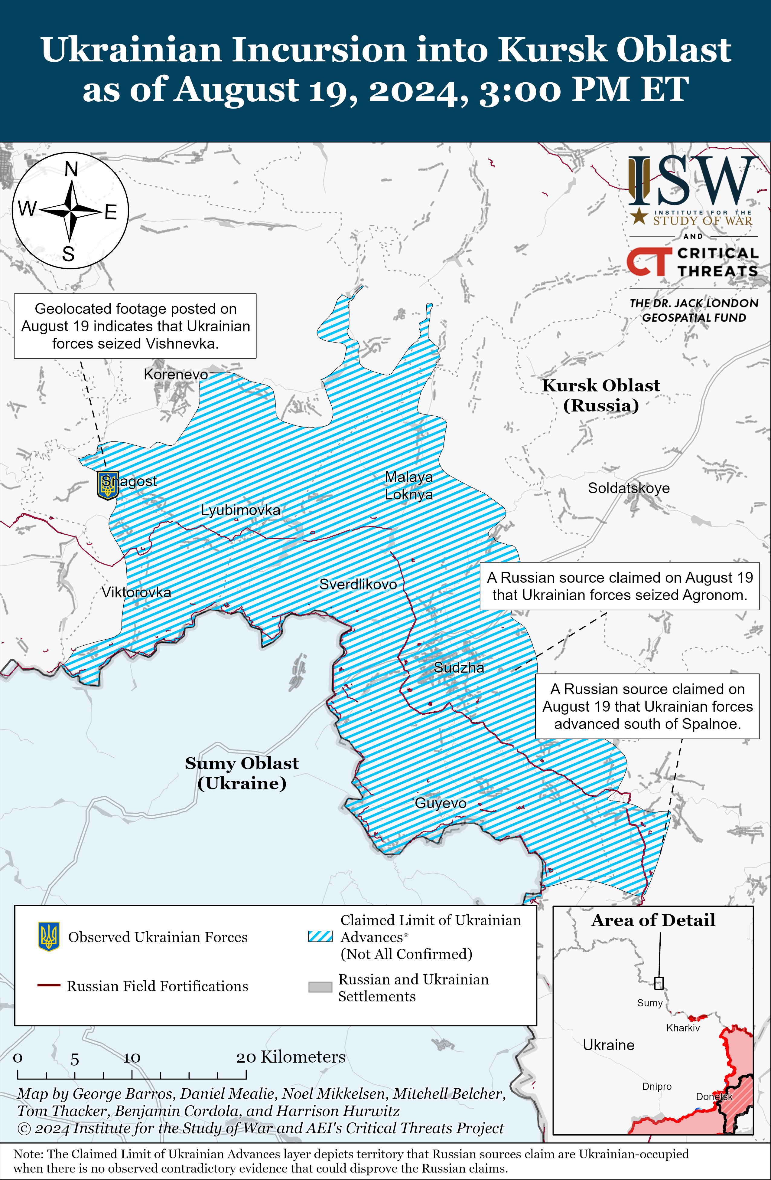 Ukrainian forces continued to marginally advance in Kursk Oblast on August 19 amid continued fighting throughout the Ukrainian salient in the area. Geolocated footage published on August 19 indicates that Ukrainian forces advanced in Vishnevka (southwest of Koronevo and 14km from the international border).[1] The Russian Ministry of Defense (MoD) claimed that Russian aviation and artillery struck Ukrainian forces operating near Vishnevka, potentially tacitly acknowledging that Ukrainian forces advanced in the area.[2] A prominent Kremlin-affiliated Russian milblogger claimed that Ukrainian forces also advanced within Russkoye Porechnoye (northeast of Sudzha and 17km from the international border), east of Agronom (just east of Sudzha and 15km from the international border), and east of Spalnoye (southeast of Sudzha and 5km from the international border).[3] The Russian MoD claimed that Russian forces repelled Ukrainian sabotage and reconnaissance attempts south of Skrylevka and Sheptukhova (both northeast of Korenevo and 22km from the international border), and other Russian sources claimed that fighting continued near Korenevo, Olgovka (just east of Korenevo), western Sudzha, and Martynovka (just northeast of Sudzha).[4] Russian milbloggers also claimed that clashes continued along the international border near Tetkino.[5] Elements of the Russian 810th Naval Infantry Brigade (Black Sea Fleet [BSF]) are reportedly operating near Olgovka; elements of the “Aida” Chechen Akhmat Spetsnaz group are reportedly operating in Sudzha; and the “Varangian” Reconnaissance-Strike Company of the 155th Naval Infantry Brigade (Pacific Fleet, Eastern Military District [EMD]) is reportedly operating in Kursk Oblast.[6] Elements of the Russian “Feniks” Mining Battalion, which were reportedly operating in the Chasiv Yar area as of late May 2024, are reportedly operating near Martynovka.[7]