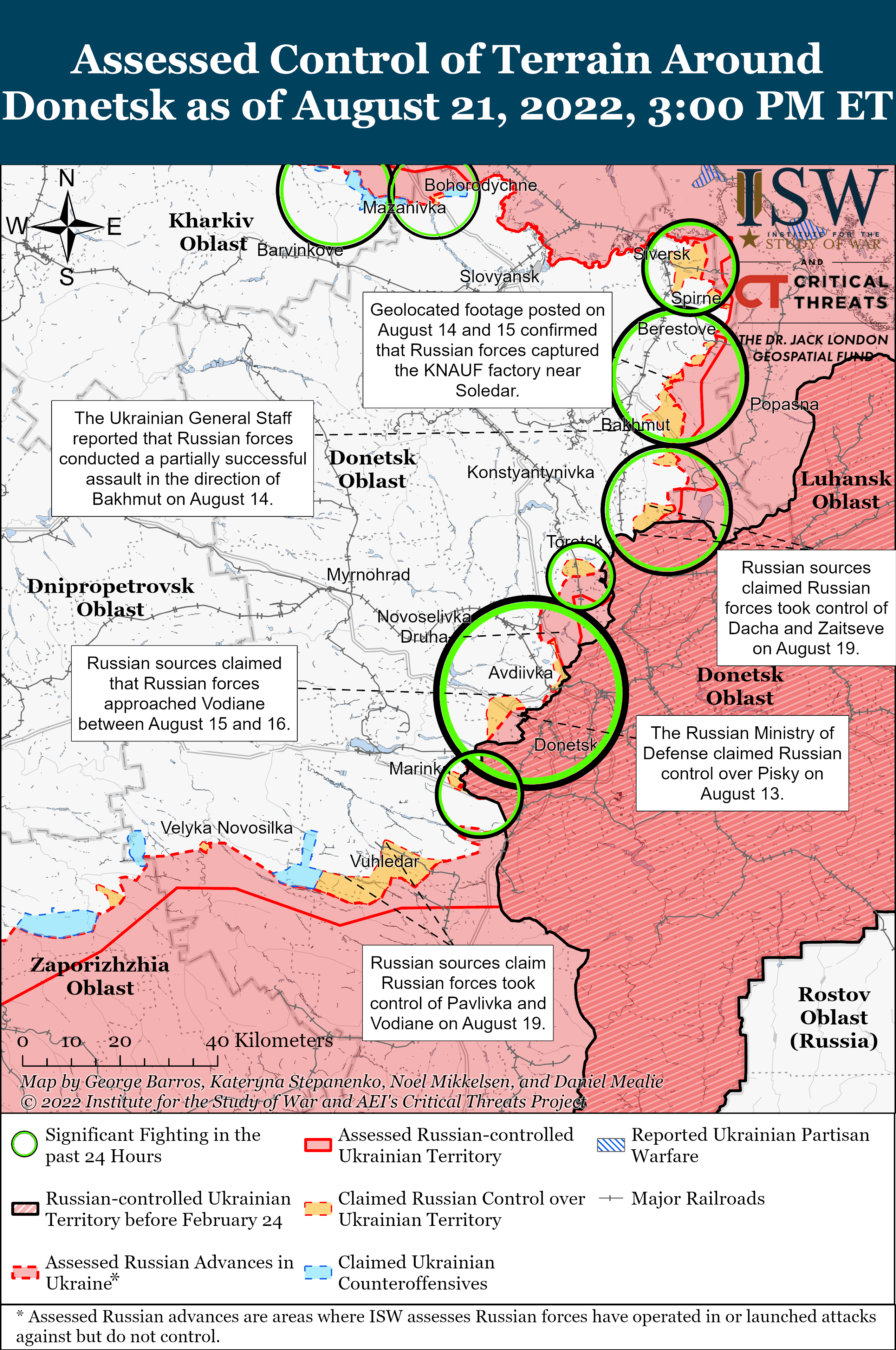 Russian forces continued to wage battles northeast and south of Bakhmut on August 21. The Ukrainian General Staff reported that Ukrainian forces repelled Russian ground assaults on Bakhmutske (about 11km northeast of Bakhmut) and Zaitseve (about 8km southeast of Bakhmut).[11] Russian forces also launched airstrikes near Zaitseve, Bakhmut, and Soledar (approximately 13km northeast of Bakhmut).[12] Geolocated footage published on August 20 showed Ukrainian artillery striking Russian infantry in the southeastern outskirts of Soledar, which likely indicates that Russian forces are still operating in the vicinity of the Knauf Gips Donbas gypsum factory.[13] The Donetsk People’s Republic (DNR) Territorial Defense claimed that Ukrainian forces are shelling Zaitseve from their positions southwest of the settlement, after DNR officials previously claimed that Russian forces seized the settlement on August 20.[14] Russian and DNR sources have claimed to control major areas of Zaitseve since August 10, and ISW cannot independently confirm these claims.[15] Geolocated footage also showed fire and smoke reportedly after Ukrainian forces struck an ammunition depot in Horlivka.[16]