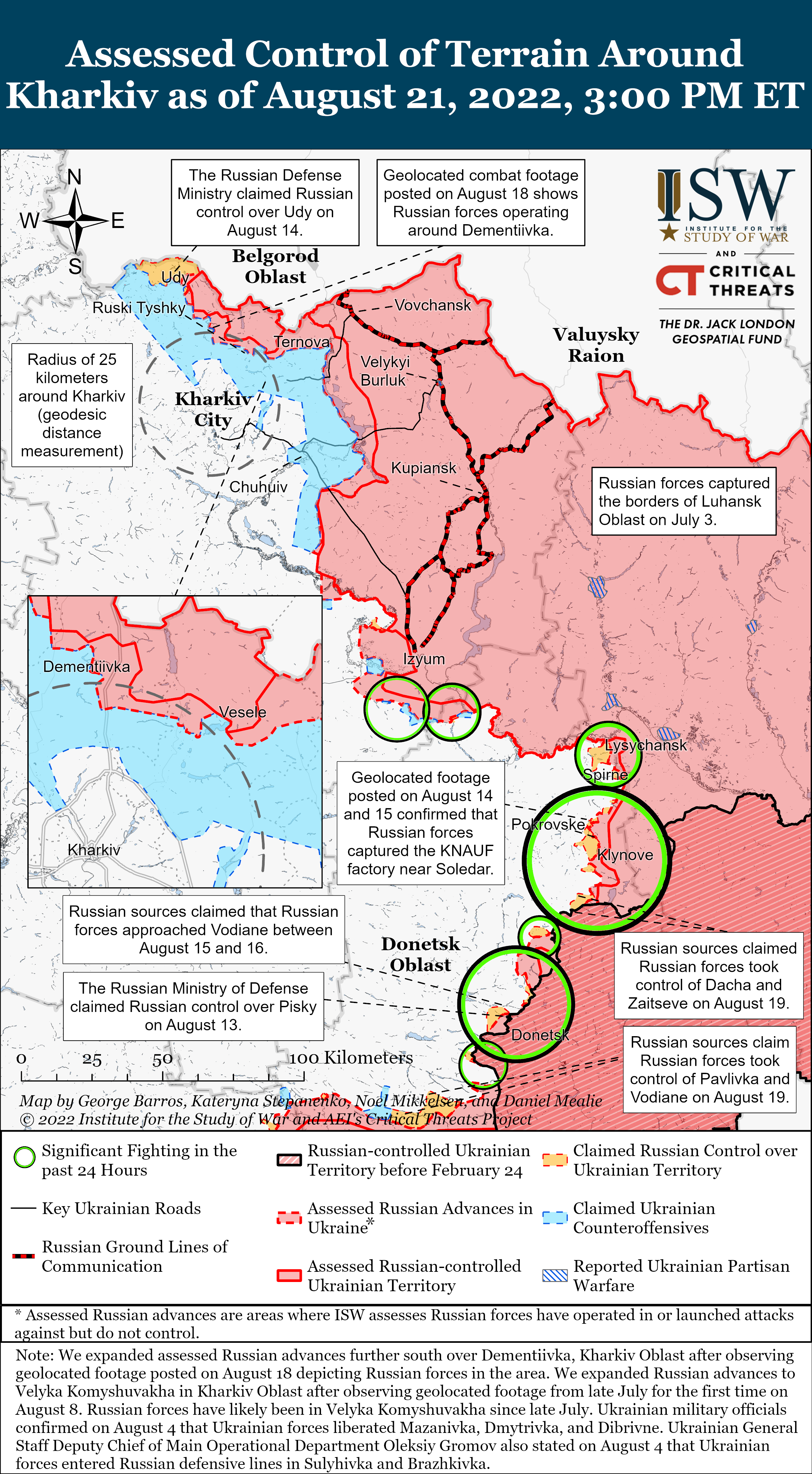 Russian forces conducted several assaults southwest and southeast of Izyum on August 21, likely in an effort to reverse Ukrainian counterattacks or regain control over Ukraine-liberated territories in the area. The Ukrainian General Staff reported that Russian forces unsuccessfully conducted a reconnaissance-in-force operation in the direction of Pasika-Bohorodychne and launched a failed assault in the direction of Dovhenke-Dolyna, both directions southeast of Izyum.[7] Russian forces also launched an unsuccessful reconnaissance-in-force attempt in the direction of Petropillia-Dmytrivka and failed to advance in the directions of Nova Dmytrivka, Dibrivne, and Kranaukhivka (all southwest of Izyum).[8] ISW previously assessed that Ukrainian forces liberated Bohorodychne, Dmytrivka, and Dibrivne, and Russian attacks in these directions may indicate that Russian forces are attempting to regain lost territories and prevent Ukrainian forces from advancing from these liberated positions further into Russian-held territory.