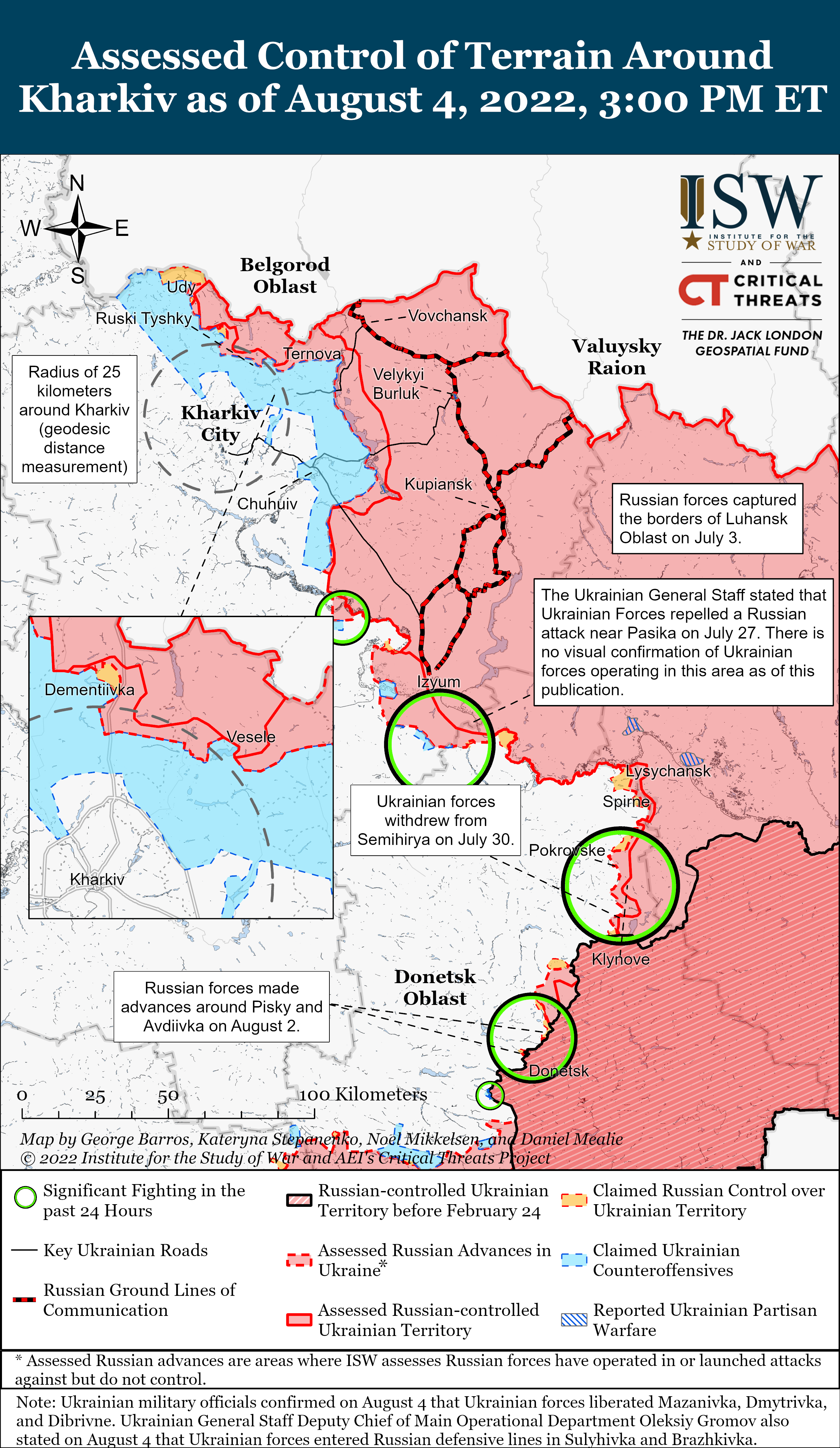 Russian forces did not conduct any confirmed ground attacks northeast of Kharkiv City and continued efforts to maintain occupied frontiers along this axis on August 4.[20] The Ukrainian Center for Strategic Communications reported that Russian forces launched four missiles from Belgorod at the Nemyshlianskyi district in southeast Kharkiv City.[21] Russian forces also continued routine shelling on Kharkiv City and settlements to the north, east, south, and southwest with mortars, tanks, and tube and rocket artillery.[22]