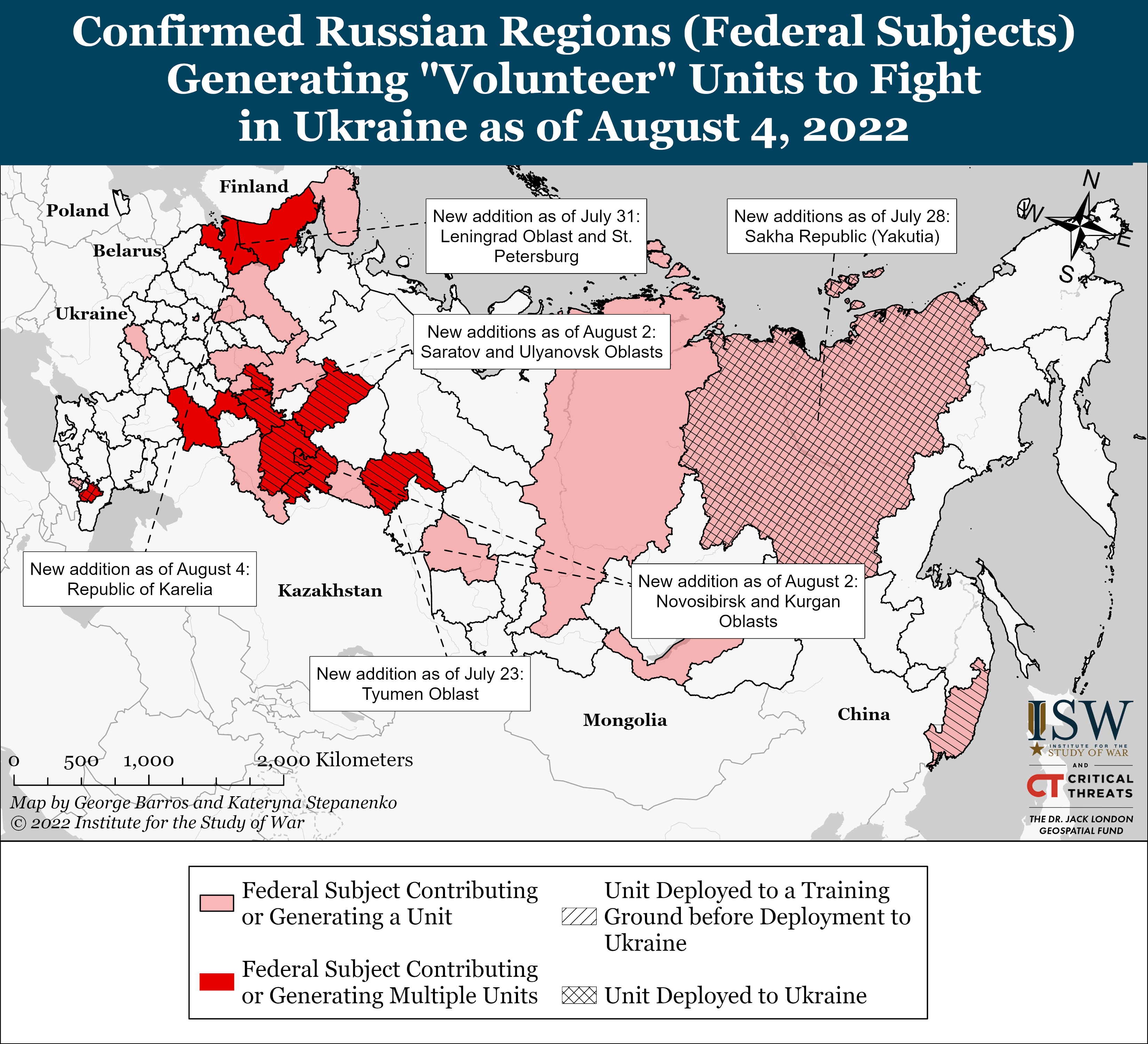 Russian military authorities continued to take measures to compensate for personnel losses in Ukraine. Ukrainian General Staff Main Operations Deputy Chief Oleksiy Gromov reported on August 4 that Russian forces are forming additional reserves to replenish units that have suffered losses in Ukraine, noting that Russian military officials are considering the redeployment of Russian troops from Syria to replenish the army.[33] Gromov also reported that Russian leadership is preparing legislative changes that prohibit the discharge of soldiers if martial law is declared in an effort to stop the outflow of military personnel.[34] Gromov added that there is a shortage of cadets for Russian military institutions, and there is “a low activity rate” of civilians signing military contracts.[35]