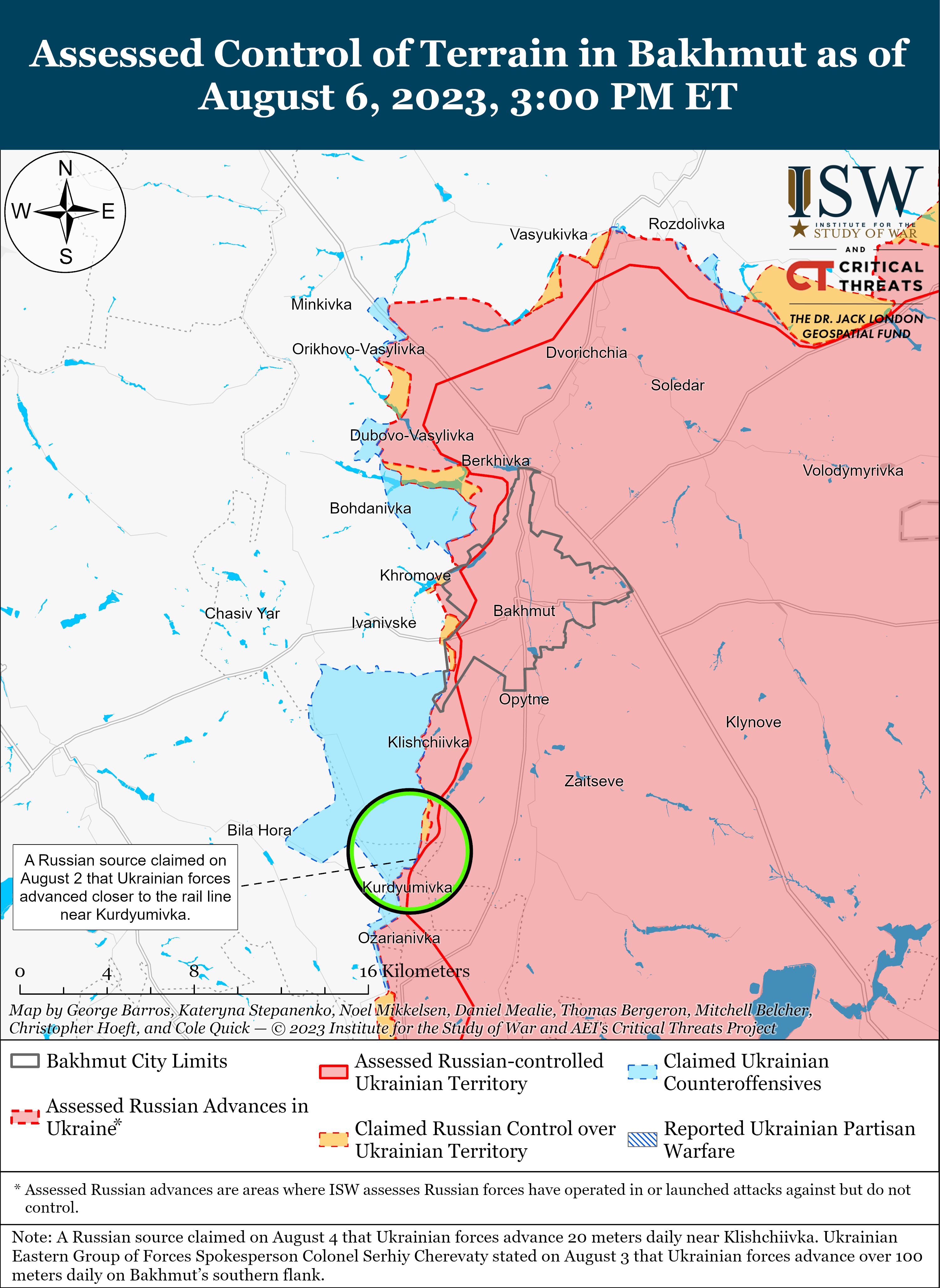 Ukrainian forces reportedly conducted offensive operations near Bakhmut on August 6, but did not make any confirmed or claimed gains. Ukrainian Main Military Intelligence Directorate (GUR) Head Major General Kyrylo Budanov stated in an interview published on August 5 that Ukrainian forces are advancing faster around Bakhmut than in southern Ukraine.[37] The Russian Ministry of Defense (MoD) and other Russian sources claimed that elements of the Russian Southern Grouping of Forces repelled Ukrainian attacks near Klishchiivka (7km southwest of Bakhmut).[38] A Russian milblogger claimed that Russian and Ukrainian artillery strikes are preventing either side from gaining a foothold or the initiative near Klishchiivka, however.[39] A Russian milblogger claimed that unspecified Russian airborne units (VDV) repelled a Ukrainian attack near Berkhivka (6km northwest of Bakhmut).[40]